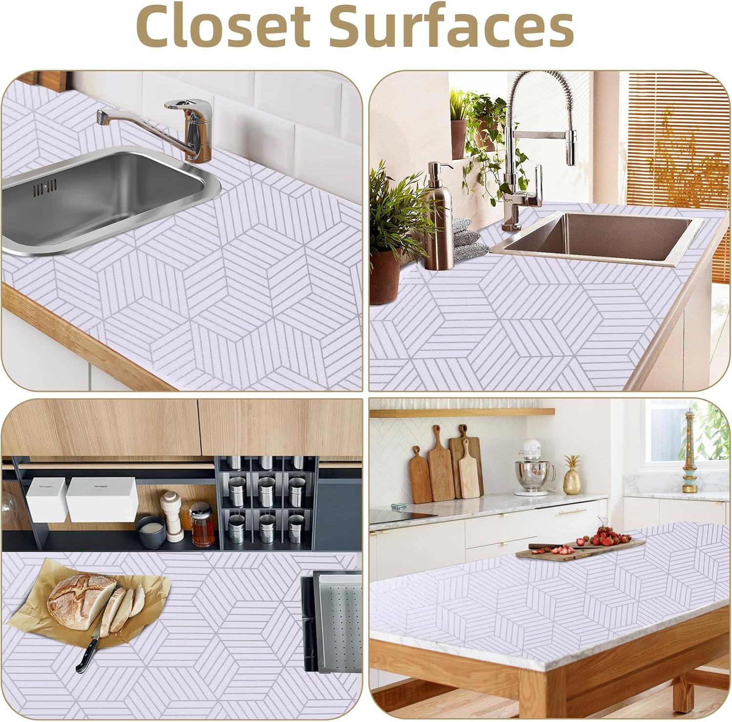 Shelf Liners for Kitchen Cabinets 12in x 10FT, Non Adhesive Cabinet Liner Strong Non-Slip Thickened Silver Geometric Easy to Clean for Shelf, Cabinet, Refrigerator with Knife and Tape Measure