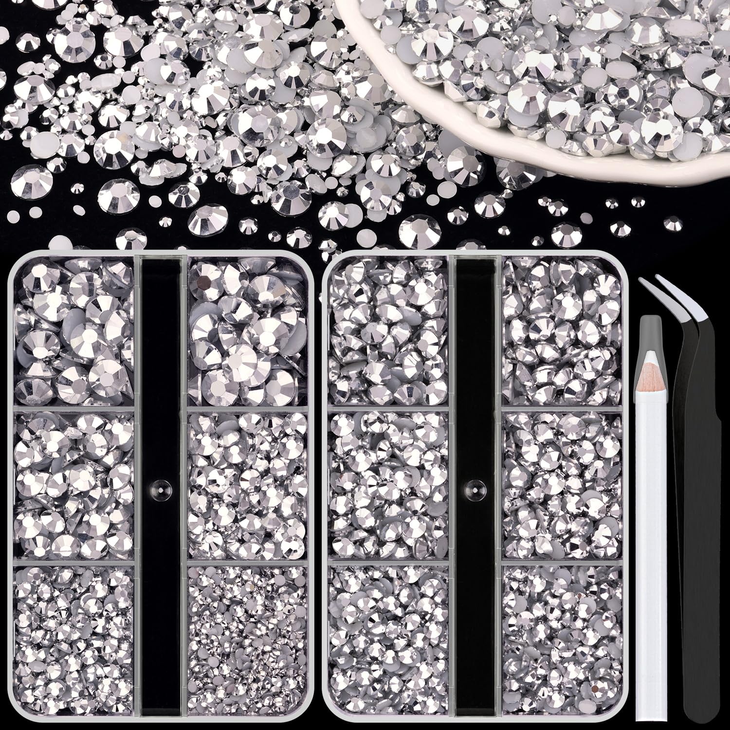 - ๐PACKAGE CONTENT -- This resin rhinestone package includes 2 boxes with 6 grids, featuring a variety of sizes: Box #1 contains 2mm x 1 grid, 3mm x 1 grid, 4mm x 1 grids, 5mm x 1 grids, and 6mm x 2 grids; Box #2 contains 3mm x 2 grids, 4mm x 2 grids, 5mm x 2 grids. 1 tweezers and 1 pickup pen are included for easily picking up of rhinestones. This set offers more large-sized gems, making it perfect for DIY craft decorations, eye makeup, face makeup and nail art.