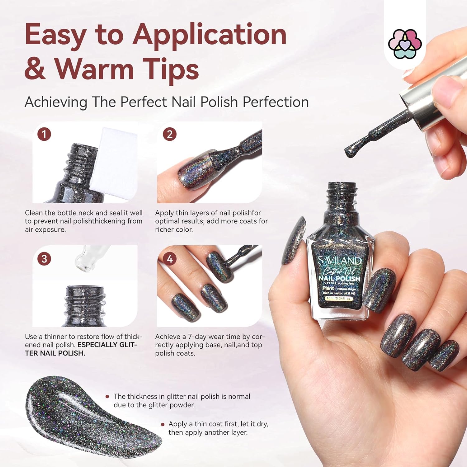 - Plant-Based Healthy Ingredients: SAVILAND holographic metallic fingernail polish is formulated with specially added castor oil, which is known for strengthening and improving nail structure, so you can say goodbye to brittle nails