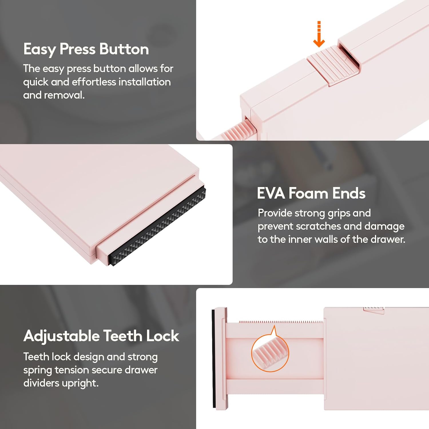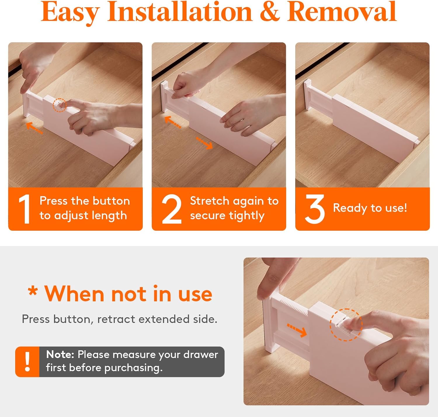 - Easy Installation & Removal: Press the top button to adjust the length before placing, and stretch it out again to secure it tightly before locking it. The strong spring tension keeps each drawer organizer securely upright. To retract, press the top button and push the stretched side.