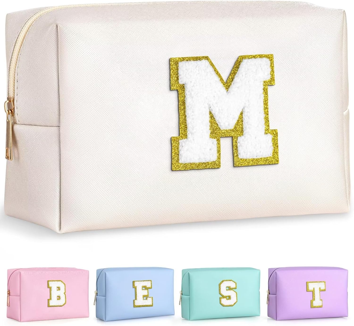 - PERSONALIZED INITIAL PATCH DESIGN: Preppy makeup bag boasts a gold glitter chenille patch that is not only stylish but also skin-friendly and comfortable to touch. The cute monogram patch has a strong personalized style, and it is sewn onto this cute makeup bag to brighten up the look and add a personalized touch