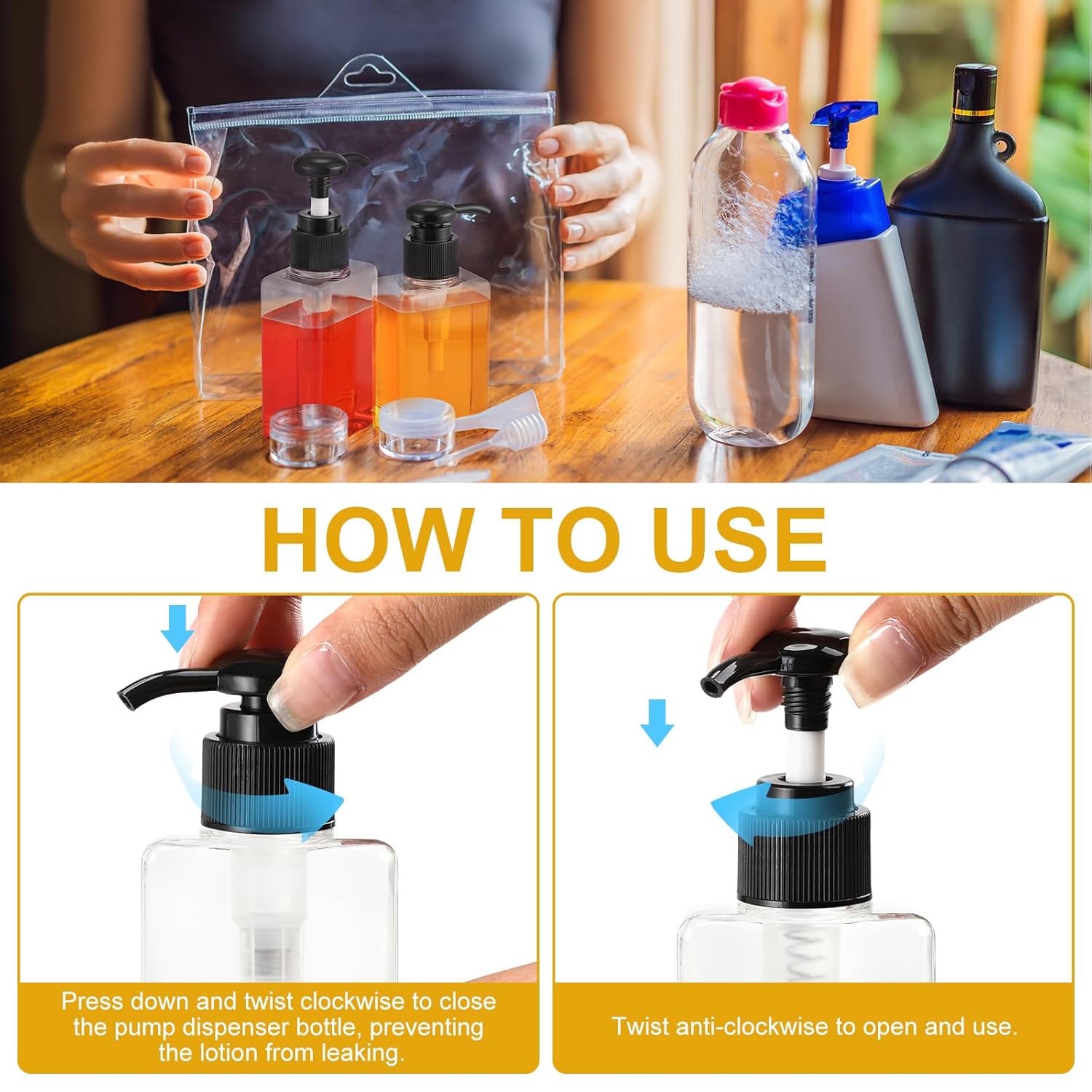- Leak Proof: the thicker thread design is screwed tighter and effectively prevents leakage; Press down and twist clockwise to close the pump dispenser bottle, preventing the lotion from leaking; Then twist anti clockwise to open and use; No worry of lotion leakage; These plastic sample pump dispensers for shower can be applied to store a variety of liquids, like shampoo, conditioner, shower gel, lotion, body moisturizer, body wash, creams, massage oil, hair oil, hand soap, hand sanitizer etc.