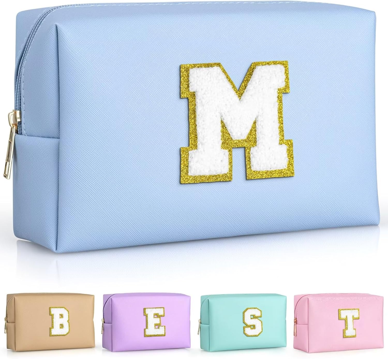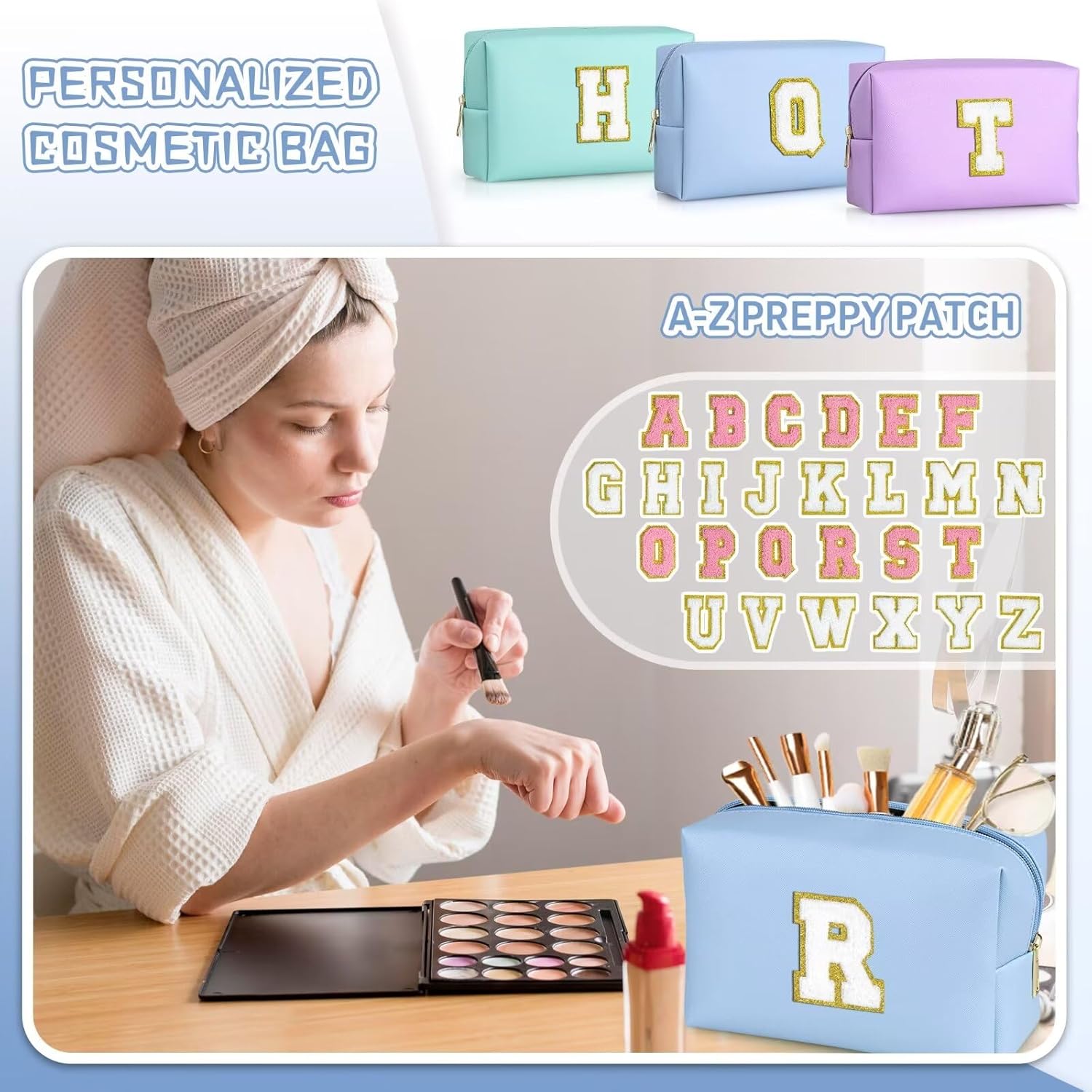 - PERSONALIZED INITIAL PATCH DESIGN: Preppy makeup bag boasts a gold glitter chenille patch that is not only stylish but also skin-friendly and comfortable to touch. The cute monogram patch has a strong personalized style, and it is sewn onto this cute makeup bag to brighten up the look and add a personalized touch