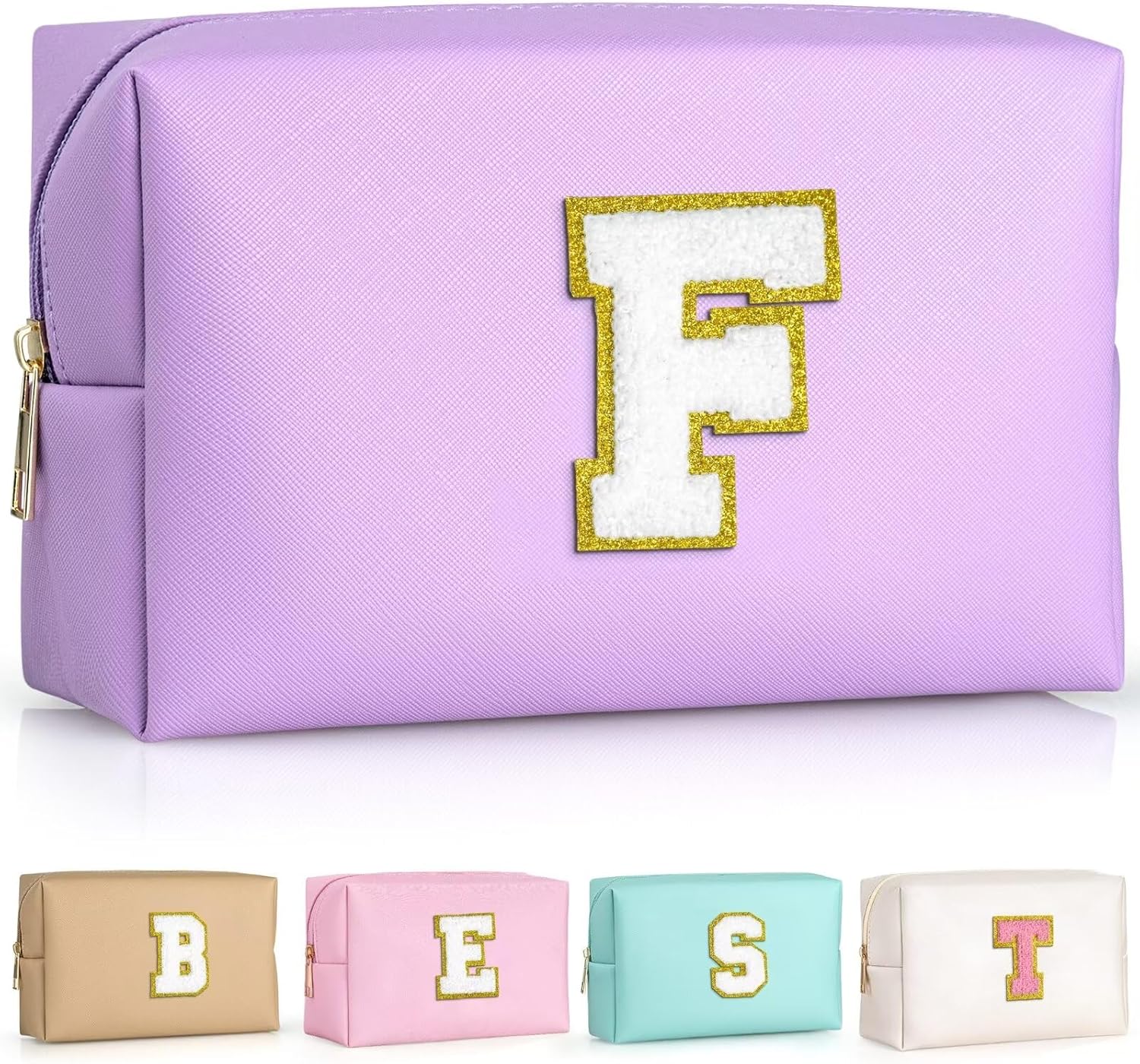 - PERSONALIZED INITIAL PATCH DESIGN: Preppy makeup bag boasts a gold glitter chenille patch that is not only stylish but also skin-friendly and comfortable to touch. The cute monogram patch has a strong personalized style, and it is sewn onto this cute makeup bag to brighten up the look and add a personalized touch