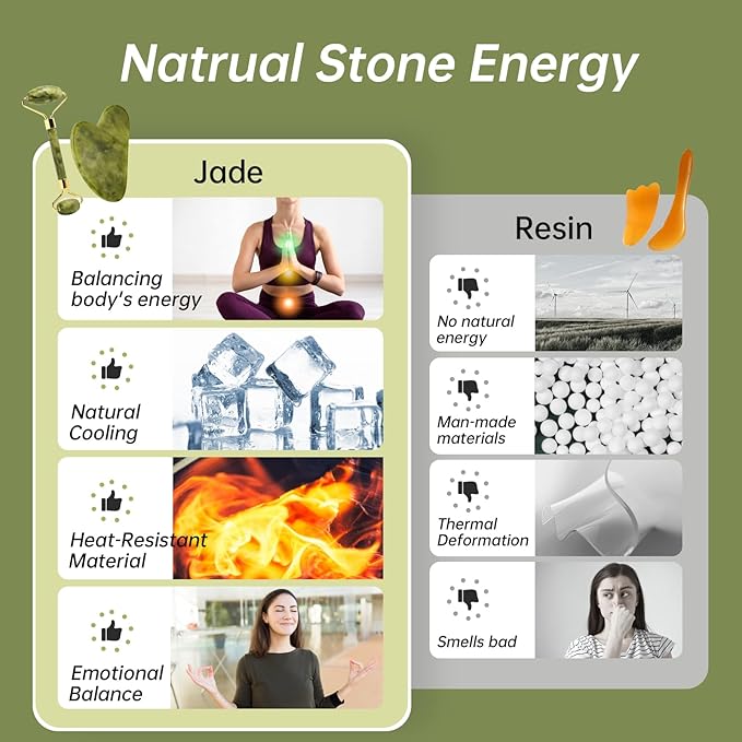 - 【Balancing Energy, Inside Out】Experience balanced minds and bodies with our real jade Gua Sha Scraping Massage Tool Set. Its magnetic energy calms minds, while the natural cooling effect after freezing can revitalize the skin again. Jade Gua Sha made of natural material is an ideal alternative to plastic guasha and ice rollers in skincare.