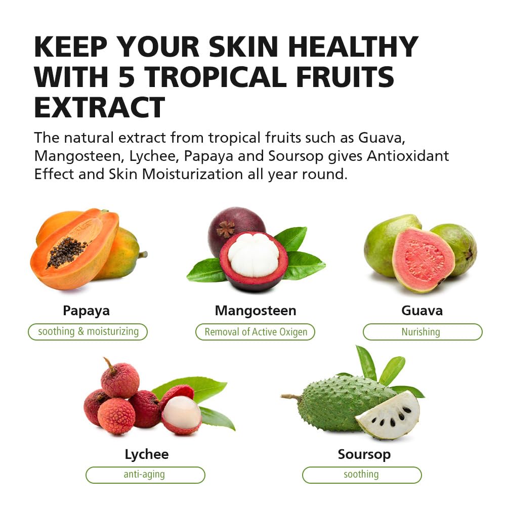 - ๐ANTIOXIDENT-RICH : Formulated with hyaluronic acid and antioxidants properties from the natural extract from tropical fruits such as Guava, Mangosteen, Lychee, Papaya and Soursop, nourishes and revitalizes the skin to protect your skin from environmental and sun damage all year round.