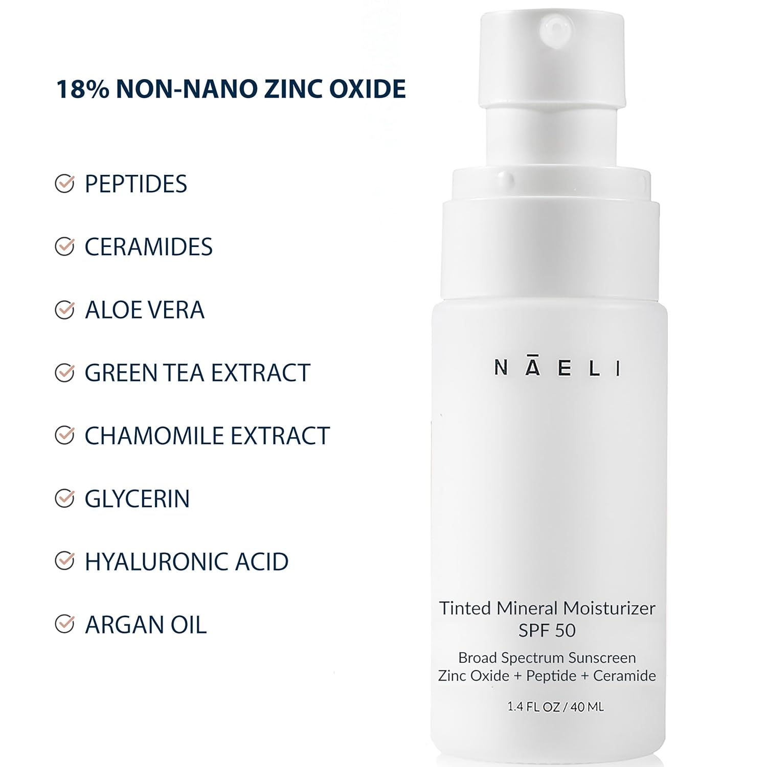 NAELI Anti Aging Tinted Moisturizer SPF 50, Mineral Sunscreen for Face with Zinc Oxide, Peptides & Ceramides, Natural Hydrating Universal Tint - 1.4 oz