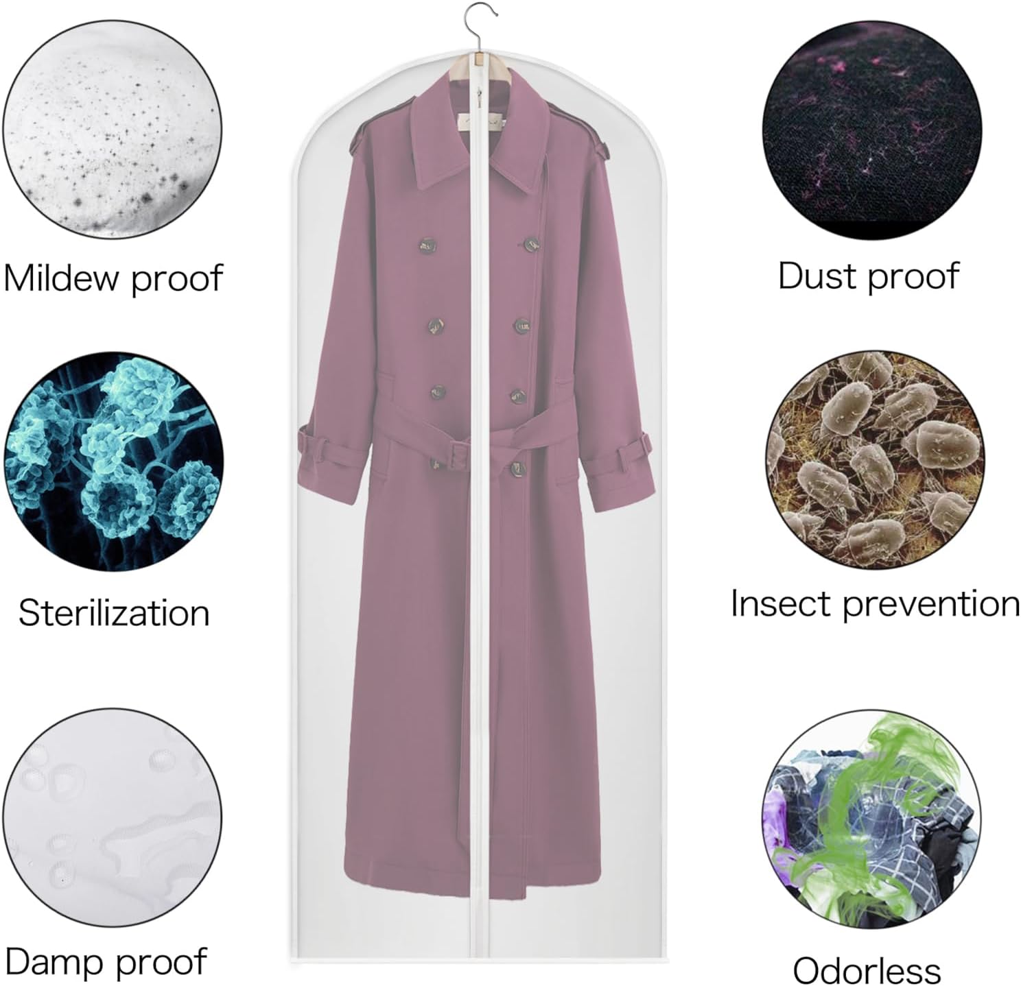 - 【Dust-proof Make Closet Neater】 The Upgraded Version clear suit bags with Zipper for closet storage are made of Soft PEVA material, perfect for storage most clothes, with these dress garment bags, each cloth have their own room to breath, keeping all your favorite / off season clothes dust and wrinkle free