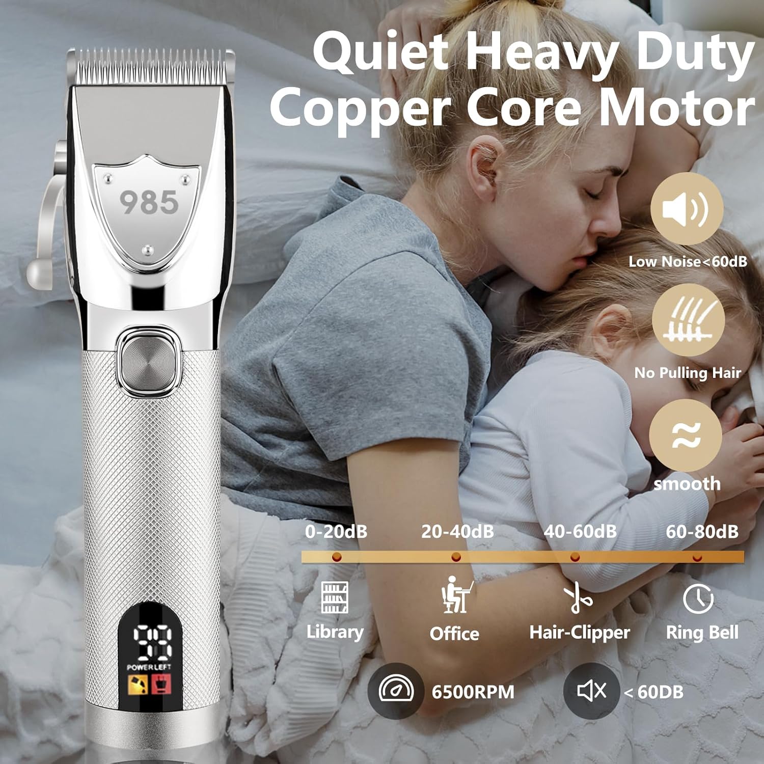 - Powerful Motor (10 W) : Both the clipper and the trimmer are equipped with high-performance copper core motors, making the hair clipper faster and more efficient, capture and cut hair evenly, fast and labor-saving, does not get hot easily when used that provides a lifetime of superior performance, When working; The noise when working is below 56 db, not only suitable for Family haircut but also for Barber Shop