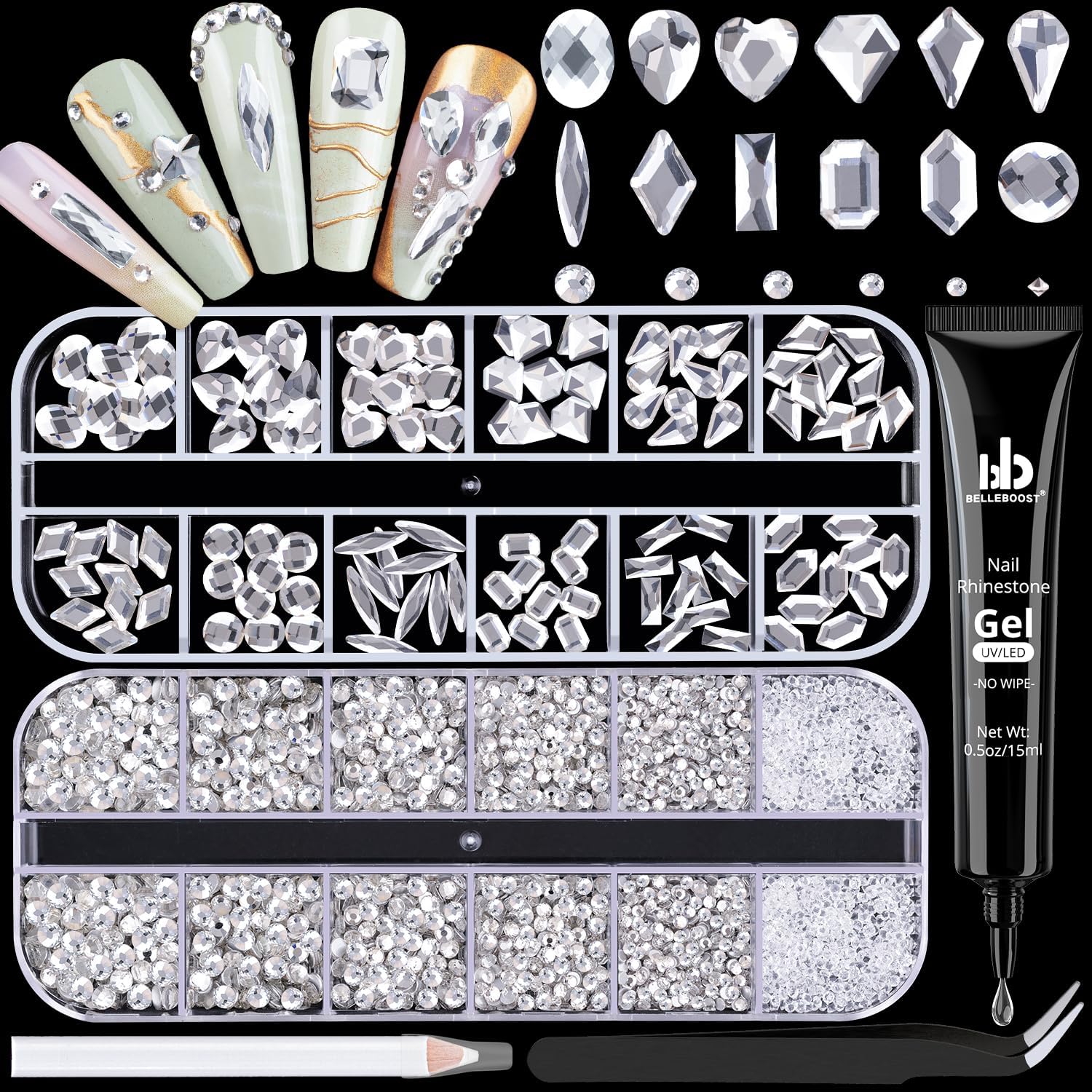 - ๐PACKAGE CONTENT -- The package contains 120Pcs multi shapes flatback gems crystal and 2510Pcs 1.5-4mm round beads, totally 2630Pcs Clear rhinestones. Additionally, 1 tweezers for large size gems and 1 pickup pen for small size gems. 1 15ml rhinestones glue gel for nail design. This rhinestones kit makes it easy for you to make any nail art you like, and will bedazzle your acrylic nails!