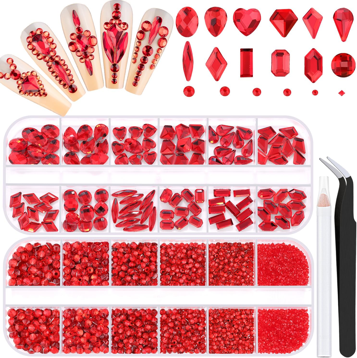 - ๐PACKAGE CONTENT -- The package contains 120Pcs multi shapes flatback gems crystal and 2510Pcs 1.5-4mm round beads, totally 2630Pcs Red rhinestones. Additionally, 1 tweezers for large size gems and 1 pickup pen for small size gems. This rhinestones kit makes it easy for you to make any nail art you like, and will bedazzle your acrylic nails!