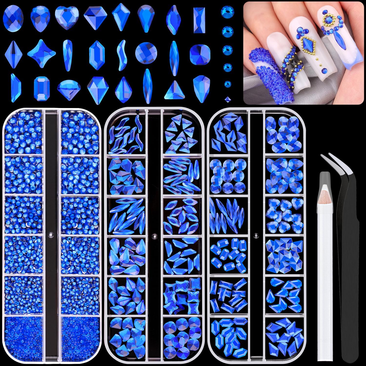 - ๐PACKAGE CONTENT -- The package contains 240Pcs multi shapes flatback gems crystal and 2510Pcs 1.5-4mm round beads, totally 2750Pcs Royal Blue rhinestones. Additionally, 1 tweezers for large size gems and 1 pickup pen for small size gems. This rhinestones kit makes it easy for you to make any nail art you like, and will bedazzle your acrylic nails!