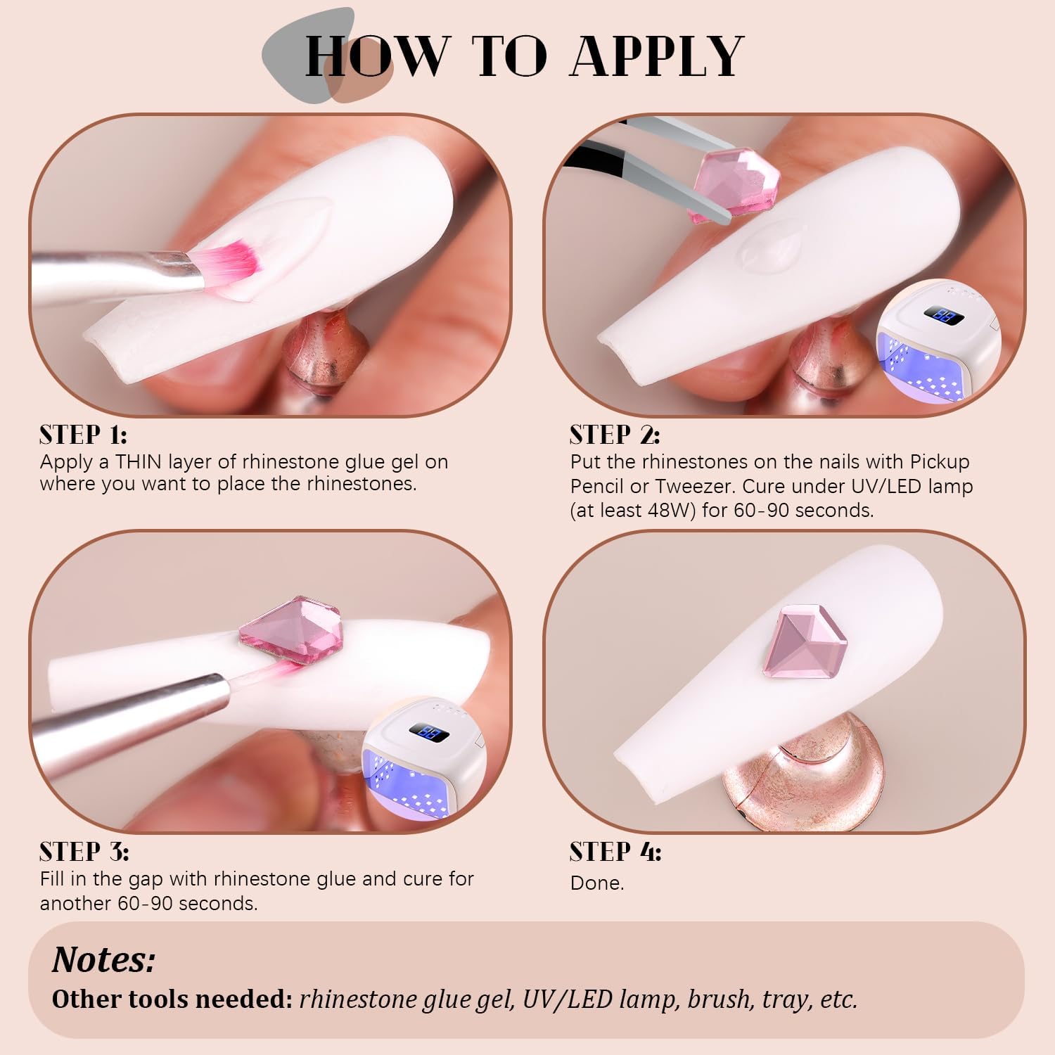 - ๐EASY TO USE -- Easy to apply on artificial nails. After applying nail polish and applying enough gel on the nails, simply use the equipped tools (pickup pen + tweezers) to pick up the crystals onto your nails to create your fabulous DIY designs! These crystals gemstones are different from those hotfix stones, they are not self-adhesive, you have to apply glue to stick them (glue is not included.)