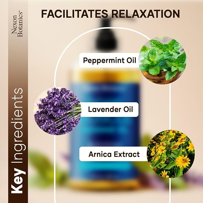 Sore Muscle Massage Oil 8 fl oz - Arnica Massage Oil for Therapy & Pain Relief - Peppermint & Lavender for Body & Muscle Relaxation - Nexon Botanics