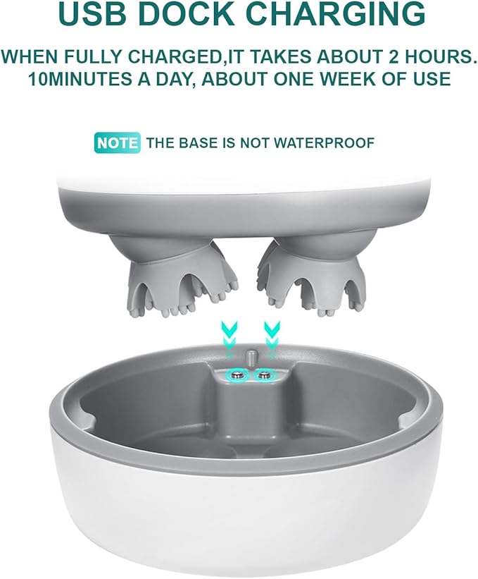 - 【Portable & Rechargeable】The scalp massager has a charging dock that just needs to be placed on to charge, and it will be securely fixed. Whenever you want to use it, you can pick it up and put it back on the dock to charge. Additionally, it is compact and lightweight, and can be used anytime, anywhere when you go out and carry it