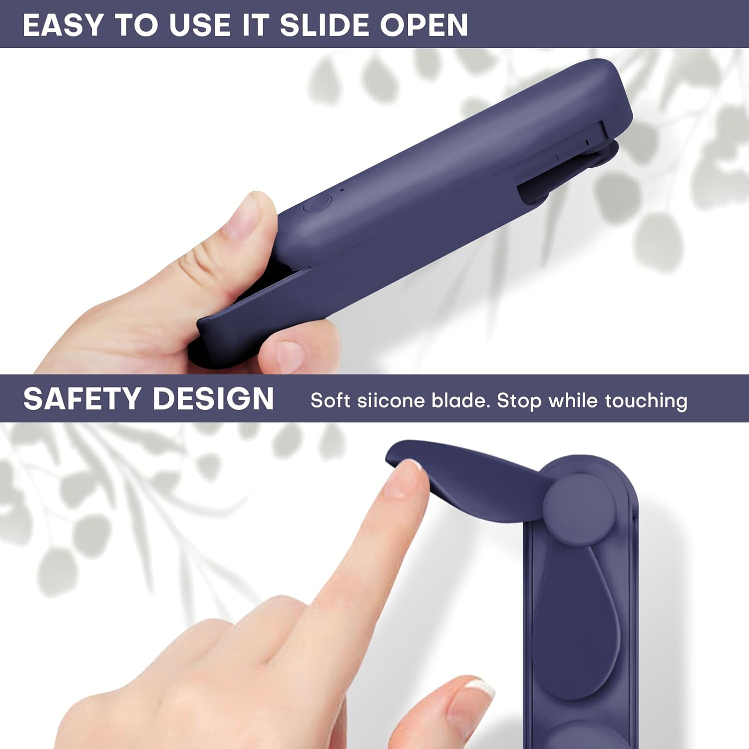 - 🧊【Safety Handheld Fan】- Made in special soft material, the fan blades are very safe. If you accidentally touch the rotating blades, the fan will automatically stop and keep you safe. Featuring with adorable look, this mini fan can also be a great gift choice for your family and friends. Cute, tiny, and useful gadgets for most people in summer. Packing List: Handheld fan x 1, Charging cable x 1, User manual x 1.