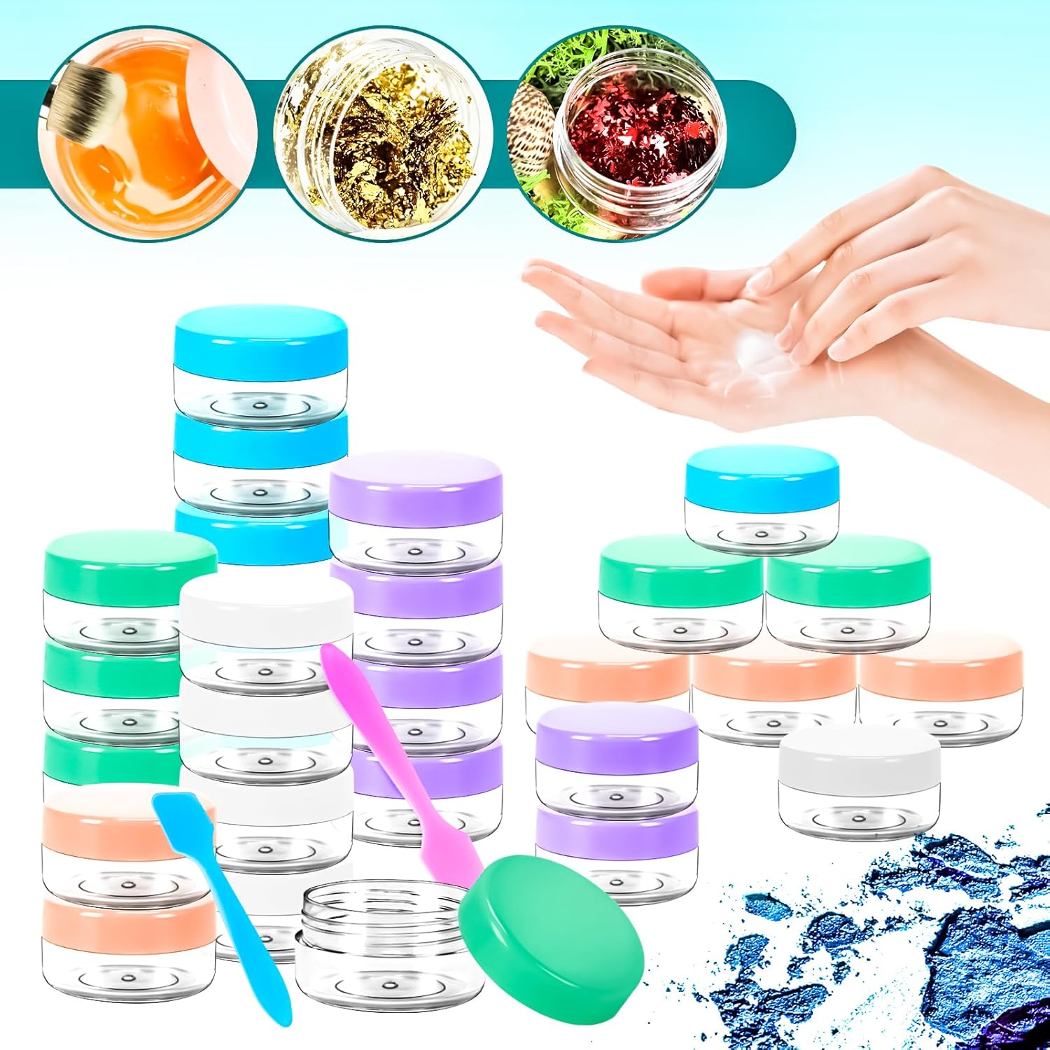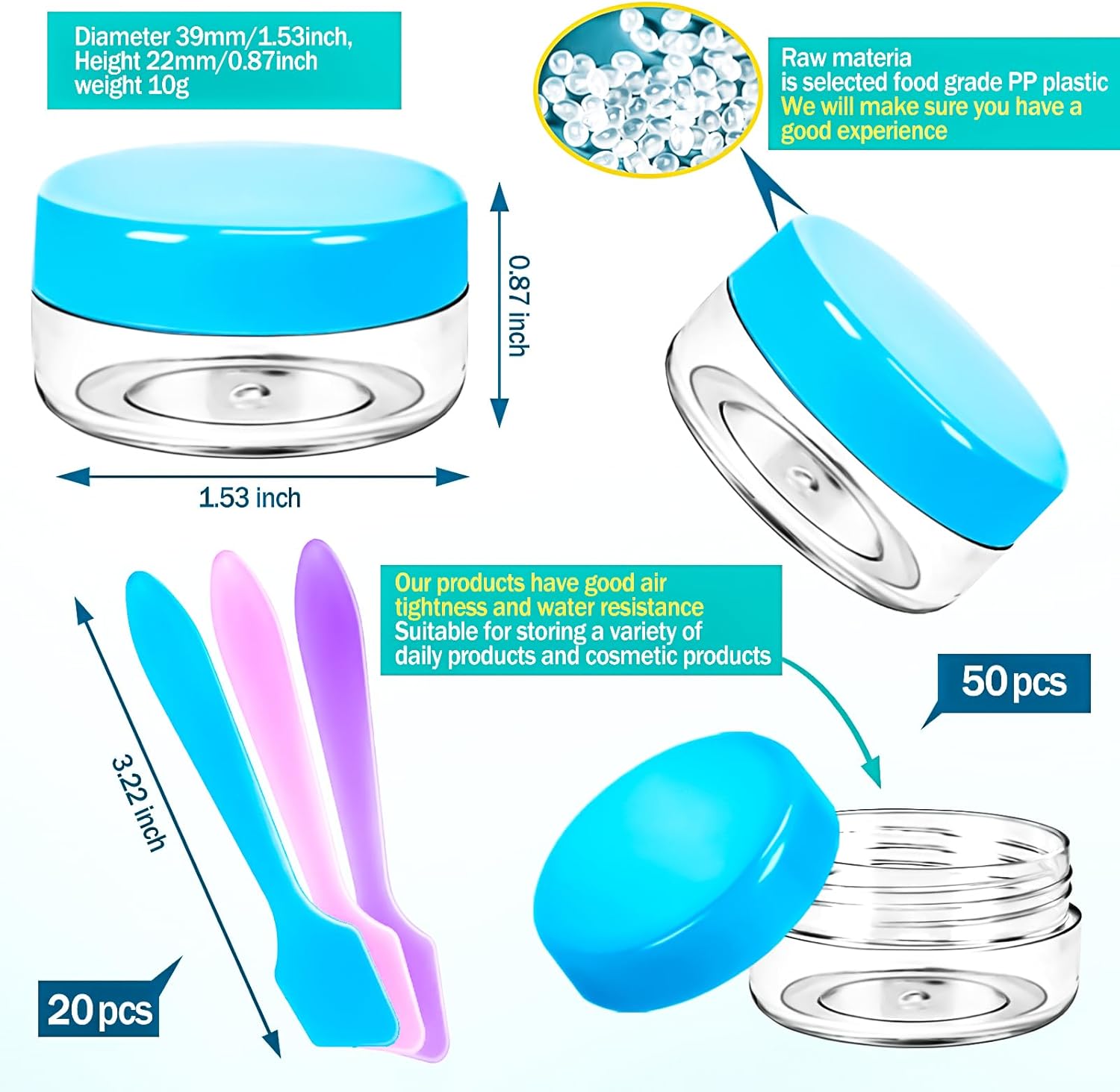 MotBach 50PCS 10g Empty Sample Containers with Colored Lids,Refillable Makeup Sample Containers, Small Sample Pot Jars Travel Makeup Containers with Mini Spatulas for Liquid Powder Creams Lotions