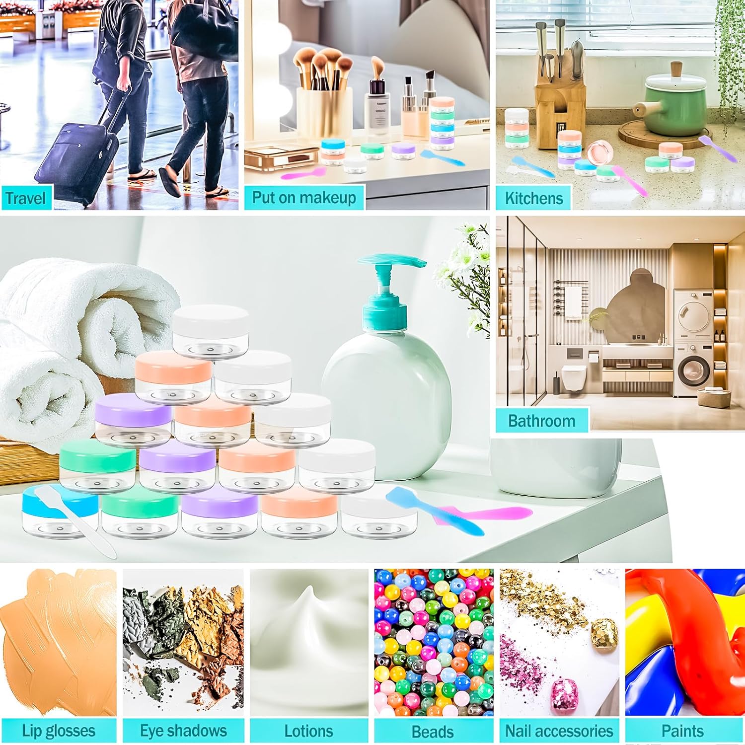 - Wide Appliaction: These reusable cosmetic jars are perfect for storing creams, cosmetics,eye shadows, lotions,lip balms, lip glosses,body butte, scrubs, nail accessories, charms, beads,earrings,sequin,small jewelry and any small accessories you want.The mini cosmetic spatulas are ideal for applying creams, lotions and other skincare products, reducing waste and mess and keeping creams clean
