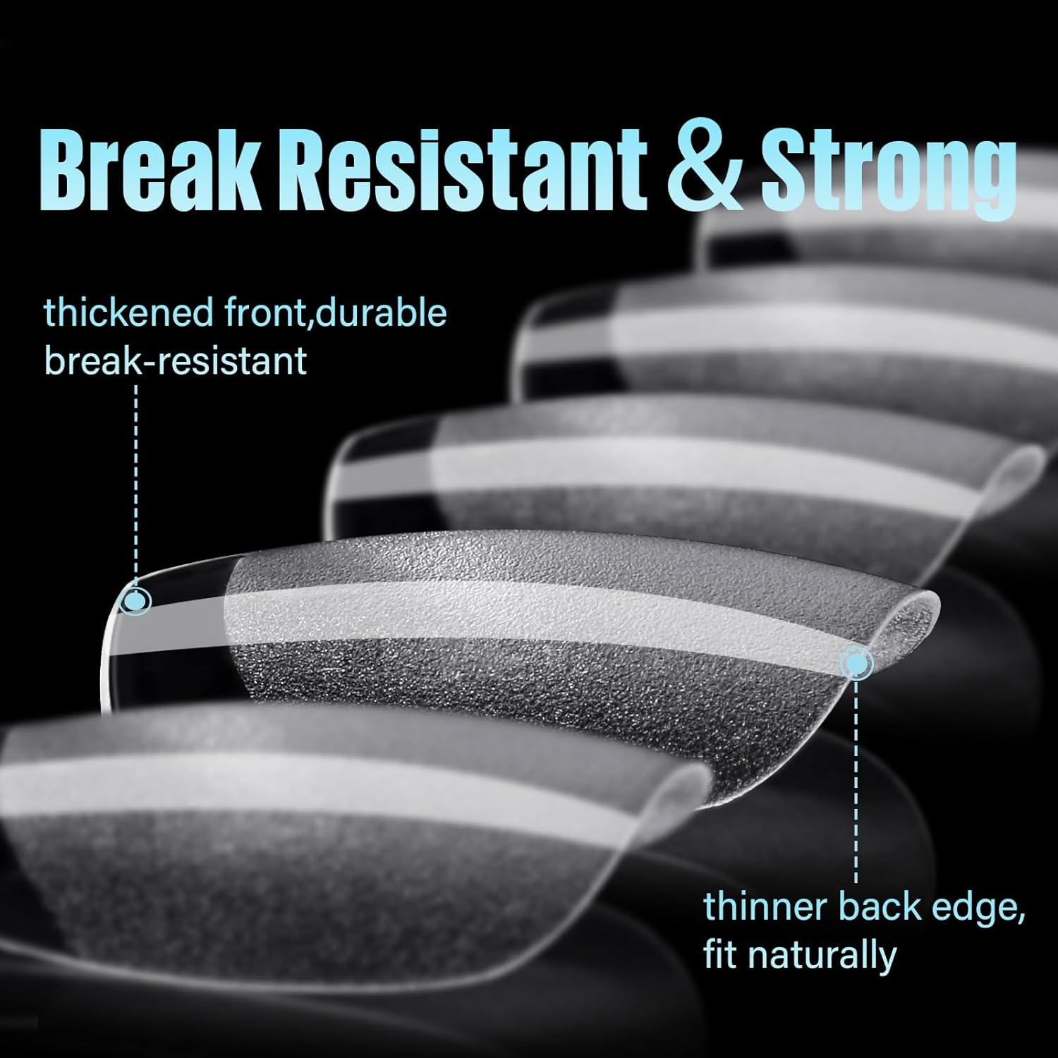 - 【Natural Fit Effect】The design feature of thick front edge and thin rear edge makes the nail tips fit our nail bed better. Smooth curves ,radians and good color condition, without separation or exposure, and your nails will look more natural. No tightness on nails.