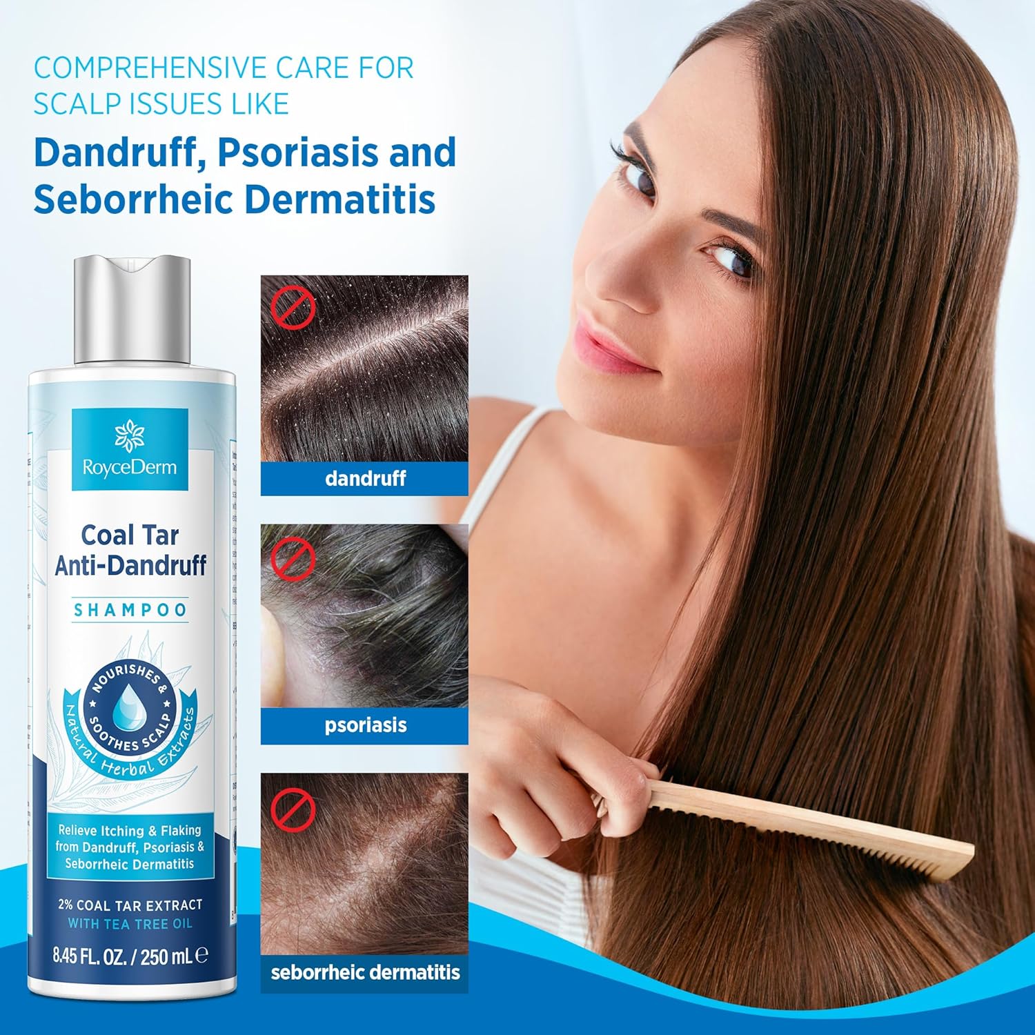RoyceDerm Coal Tar Dandruff Shampoo: Extra Strength 2% Coal Tar Extract Medicated Gel for Rapid Scalp Hair Relief targets dandruff, psoriasis, and seborrheic dermatitis - Hydrating & Natural Fragrance