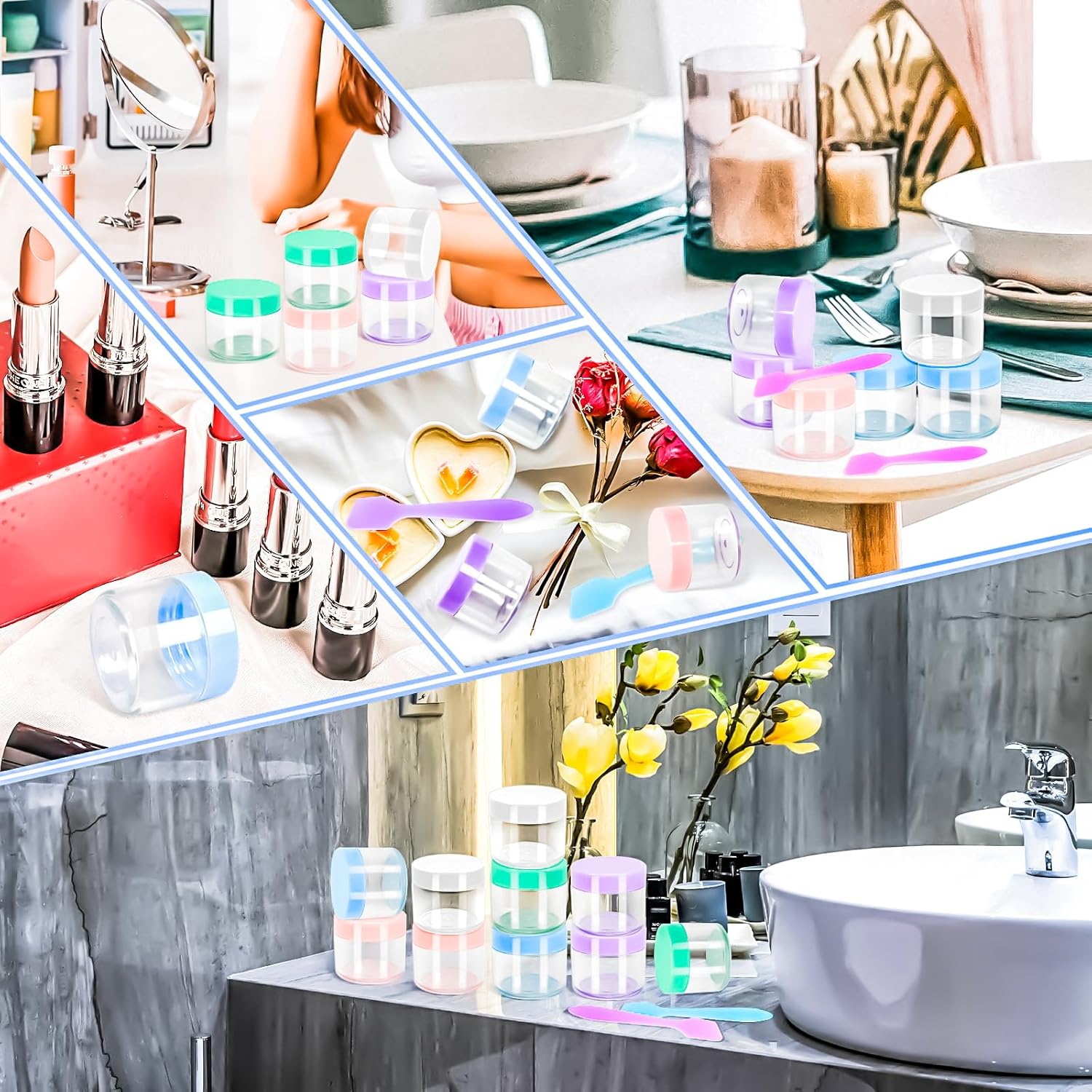 - Wide Appliaction: These reusable cosmetic jars are perfect for storing creams, cosmetics,eye shadows, lotions,lip balms, lip glosses,body butte, scrubs and so on.And the mini spatulas allow you dispense creams, lotions and other skincare products, reducing waste and mess and keeping creams clean