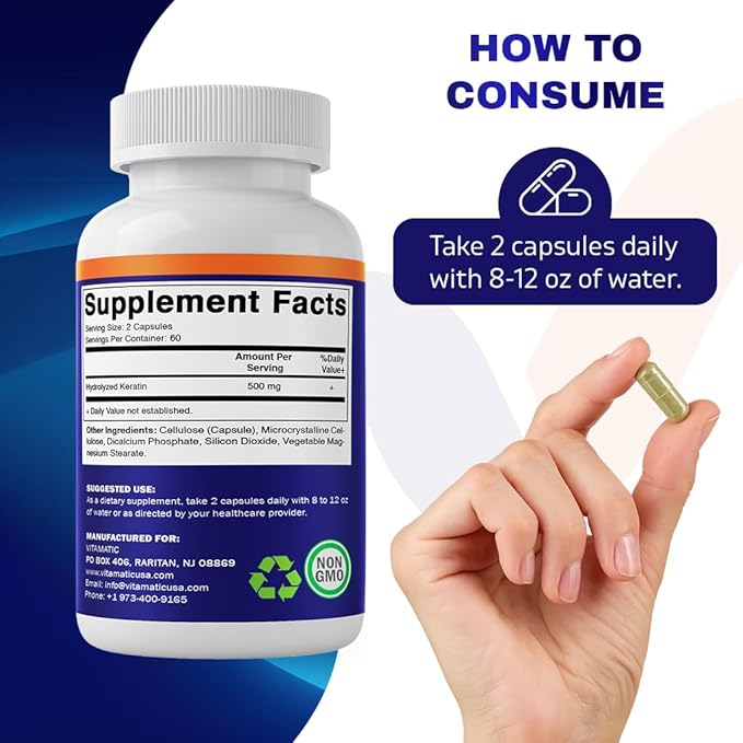 Vitamatic Hydrolyzed Keratin 500mg per Serving - 120 Vegetarian Capsules - Keratin Supplements for Healthy Hair Skin & Nails for Adults