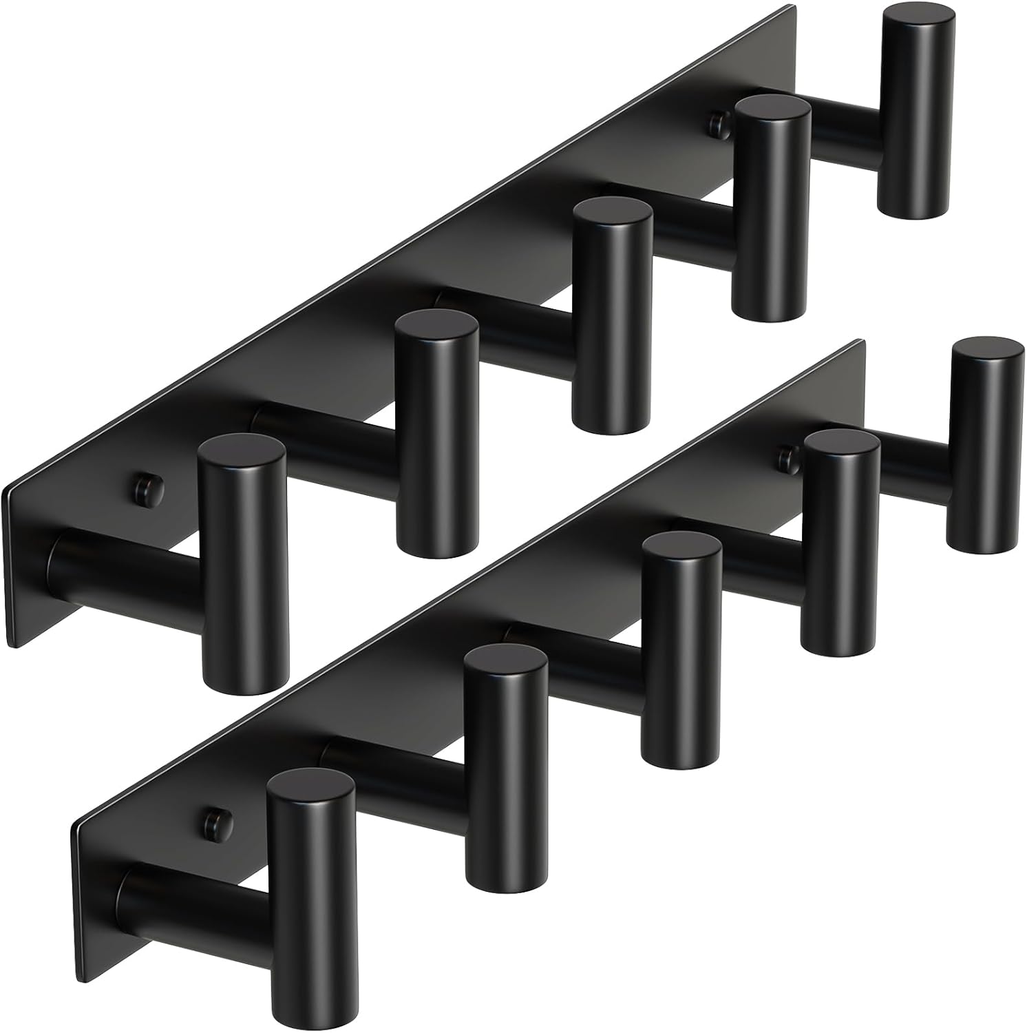 HUFEEOH 2 Pack Coat Hooks Wall Mount, Black T Shaped 5 Hooks Stainless Steel Wall Hooks Towel Rack for Hanging, Heavy Duty Key Holder Hat Rack Used for Bathroom Mudroom Entryway