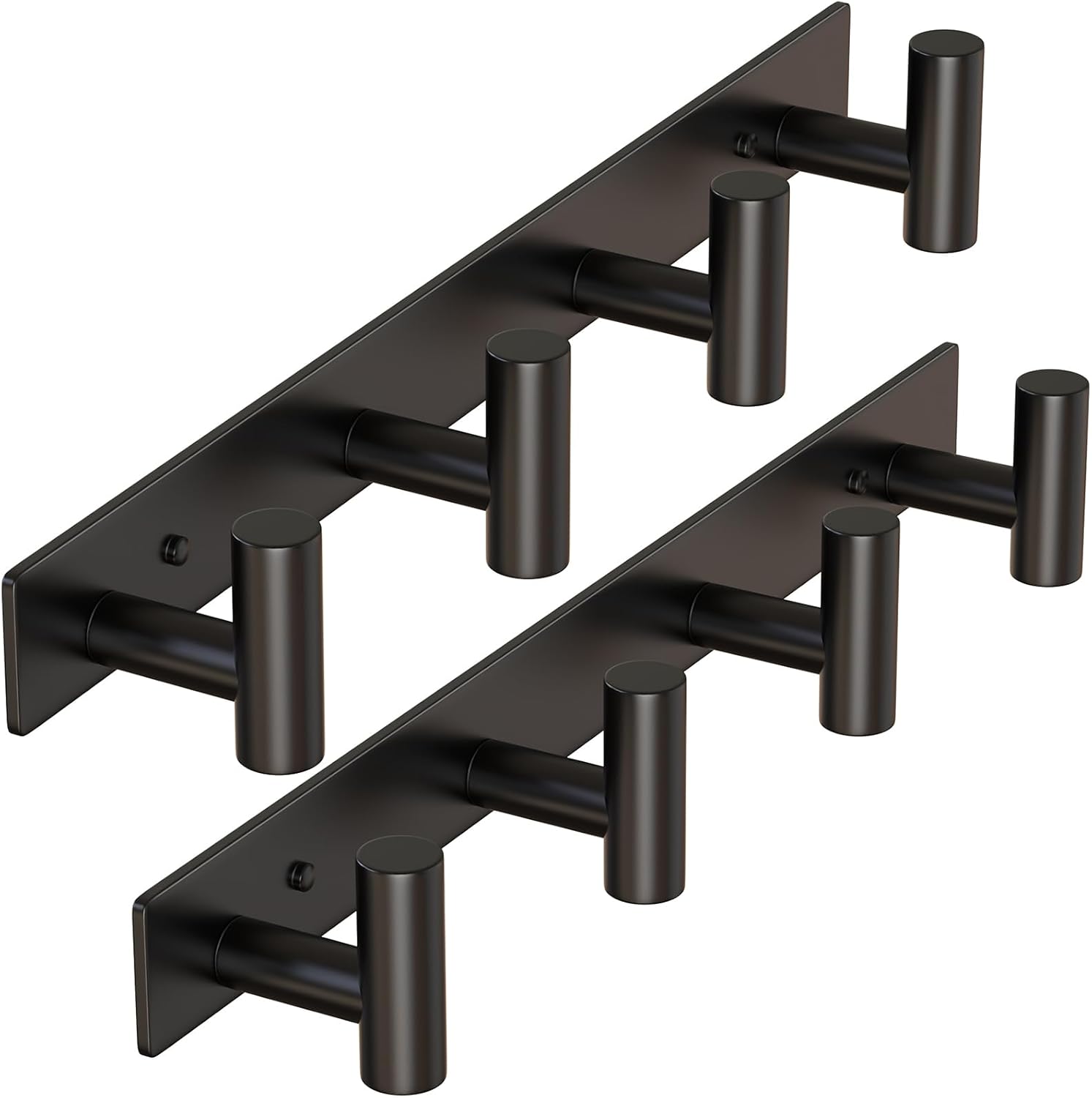 HUFEEOH 2 Pack Coat Rack Wall Mount, Stainless Steel T Shaped 4 Hooks Coat Hooks for Bathroom, Heavy Duty Wall Hooks Towel Hooks for Hanging, Black Towel Rack Purse Hanger for Mudroom Entryway