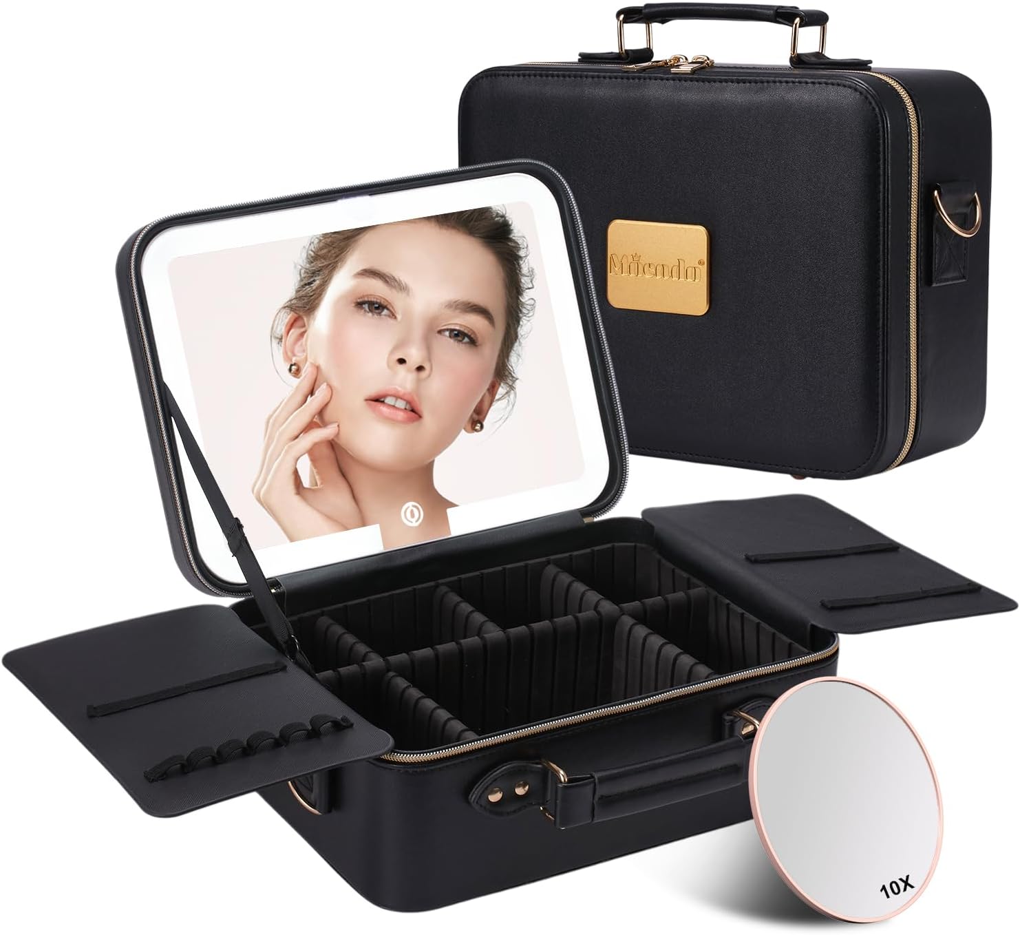 Mocado Travel Makeup Bag with LED Lighted Mirror,Makeup Case with 3 Color Lighted Setting and 10x Magnifying Mirror, Portable Storage and Adjustable Dividers (Black with Hard Leather)