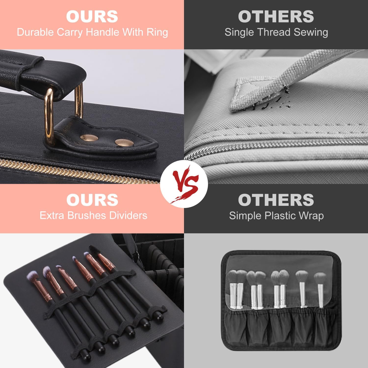 - Flexible and Large Storage Space:Reasonable design makes the makeup bag easy to carry, not only can you store cosmetics and makeup tools, but also jewelry, electronic accessories, camera accessories, toiletries, etc. Removable EVA sponge divider Can DIY the space you need to meet your needs. Can accommodate a variety of sizes of cosmetics and makeup brushes. Which can well protect the cosmetics inside, ensure no breakage or leakage, and also keep them clean and dry.