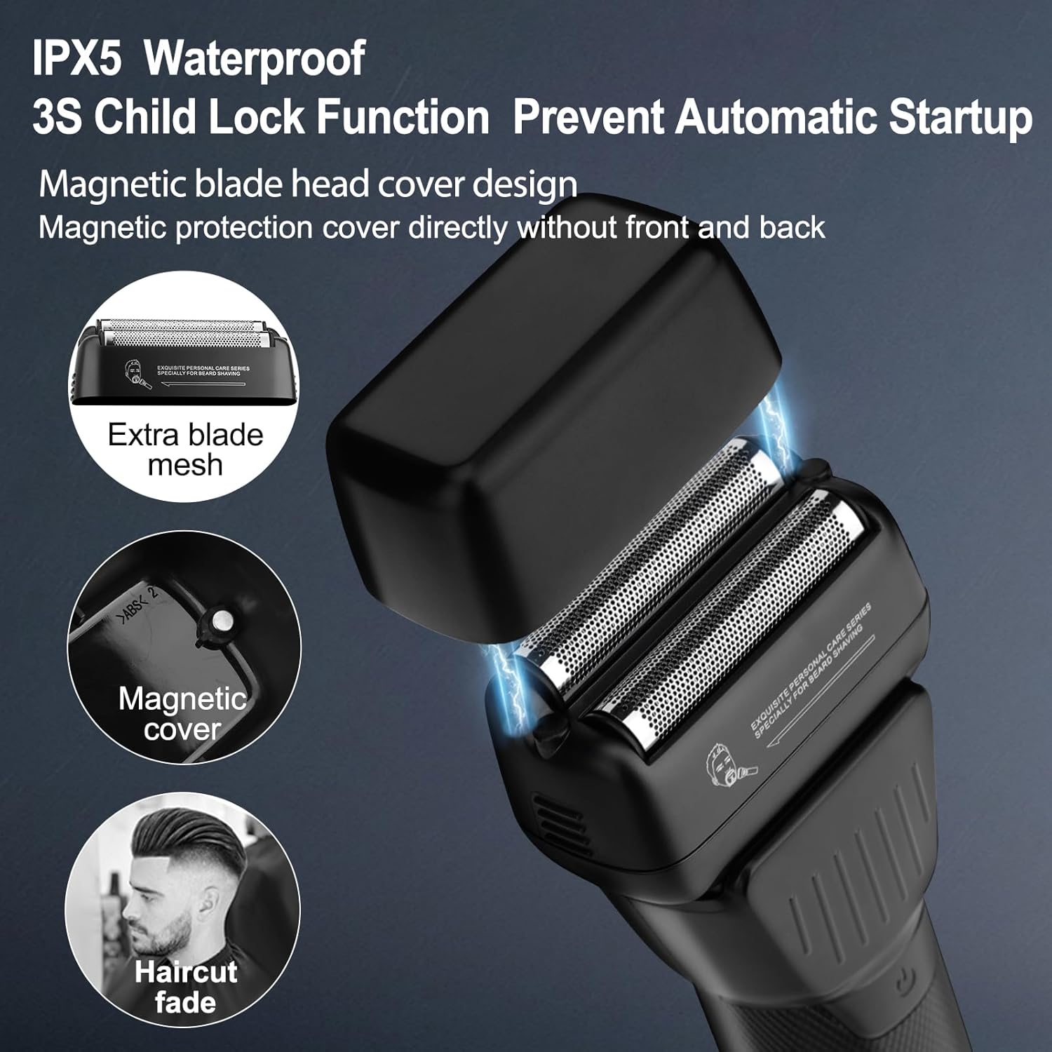 - Double Floating Razor: Electric shaver comes with smart dual floating shaving foil head and replaceable bald head net, that hug the contours of your head / face and neck, suitable for bald head and beard, body hair. The blade of electric shaver is easy to disassemble & cleaning. Travel lock design: Press and hold for 3 seconds to turn on the device, and after use, press and hold for 3 seconds to turn off and lock the machine. providing you with a comfortable and convenient shaving experience