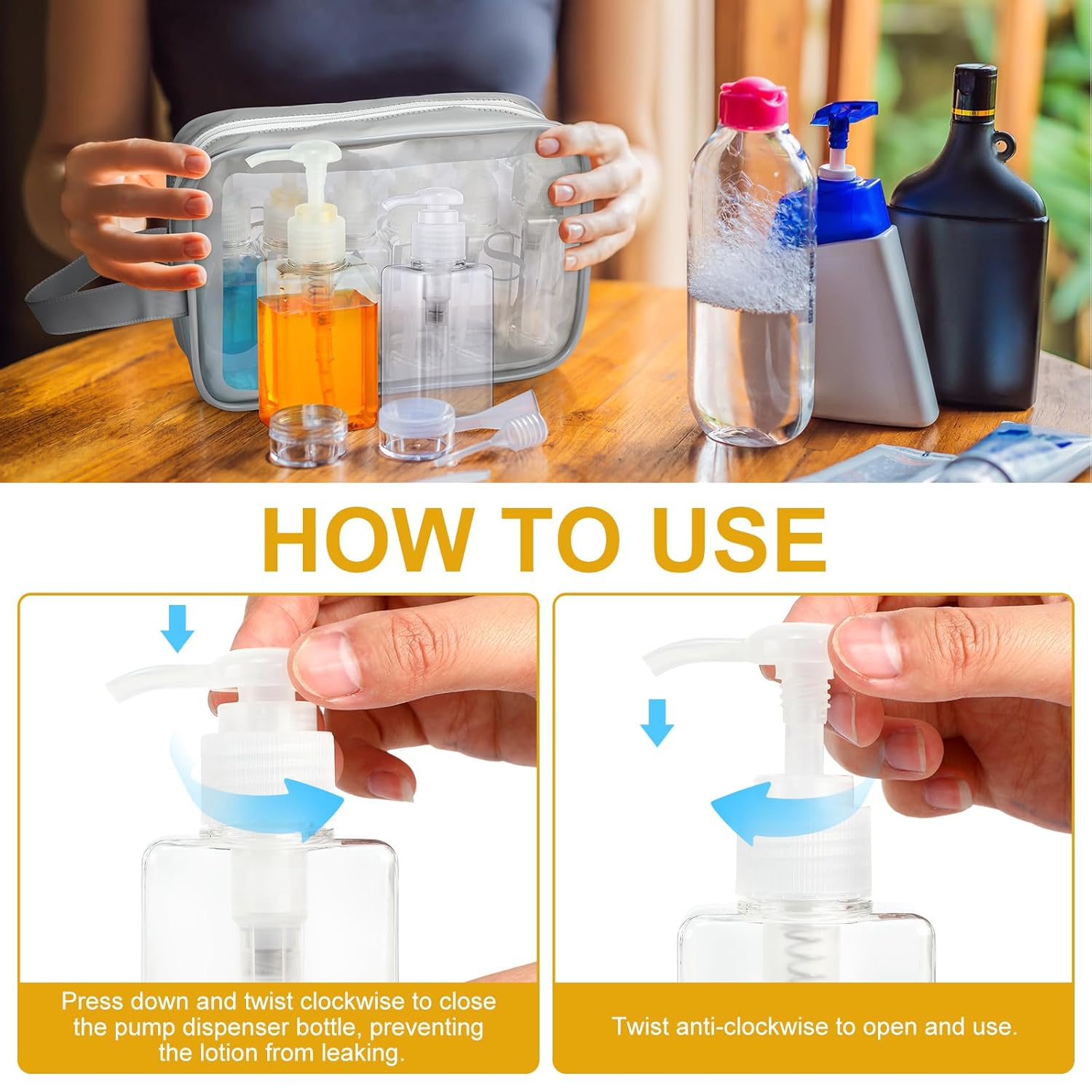 - Leak Proof: the thicker thread design is screwed tighter and effectively prevents leakage; Press down and twist clockwise to close the pump dispenser bottle, preventing the lotion from leaking; Then twist anti clockwise to open and use; No worry of lotion leakage; These plastic sample pump dispensers for shower can be applied to store a variety of liquids, like shampoo, conditioner, shower gel, lotion, body moisturizer, body wash, creams, massage oil, hair oil, hand soap, hand sanitizer etc.