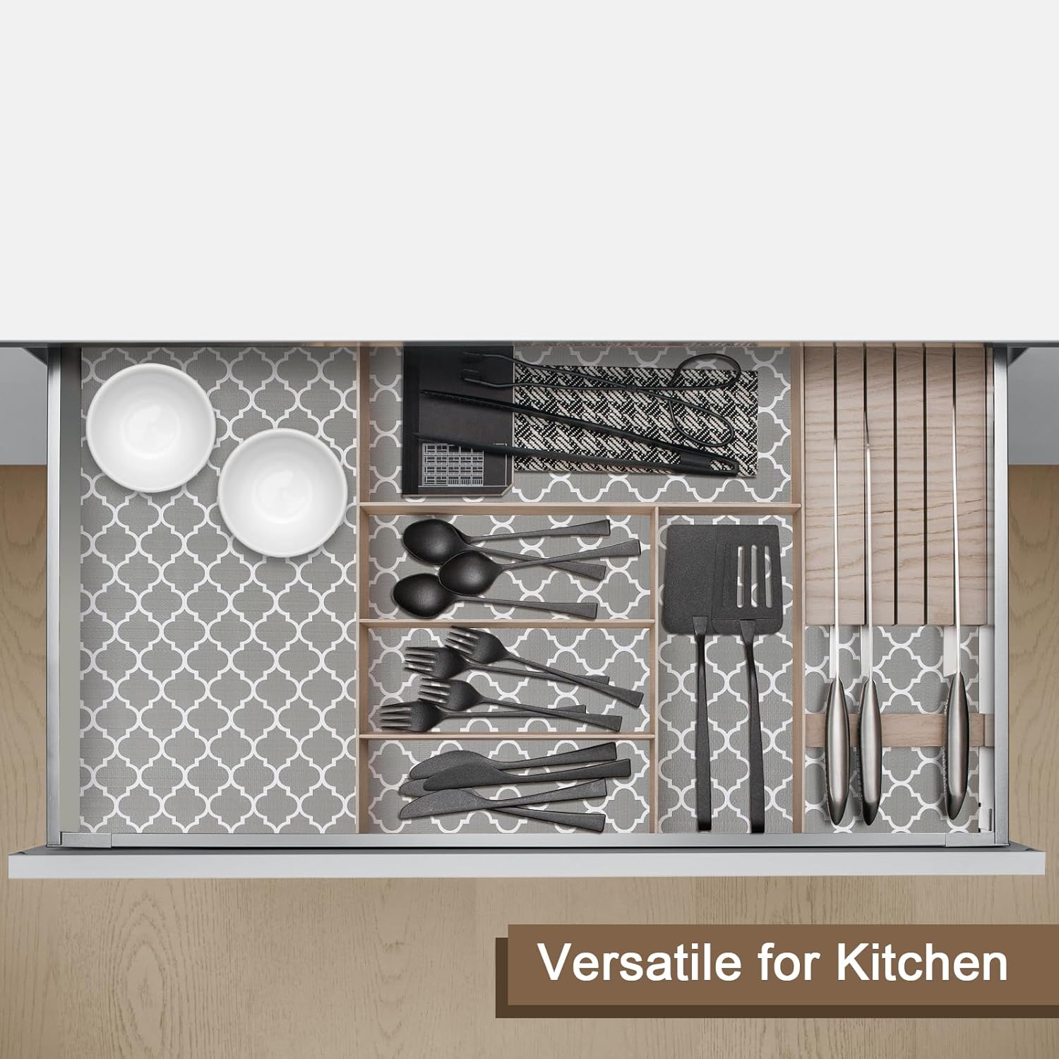 - 【EASY TO CUT】Shelf liner non slip is easy to cut and suitable for all kinds of spaces Whether it's the kitchen, bathroom, study or bedroom, this cabinet shelf liner is a perfect match. Its design makes it suitable for all occasions and helps you keep your space neat and organized.