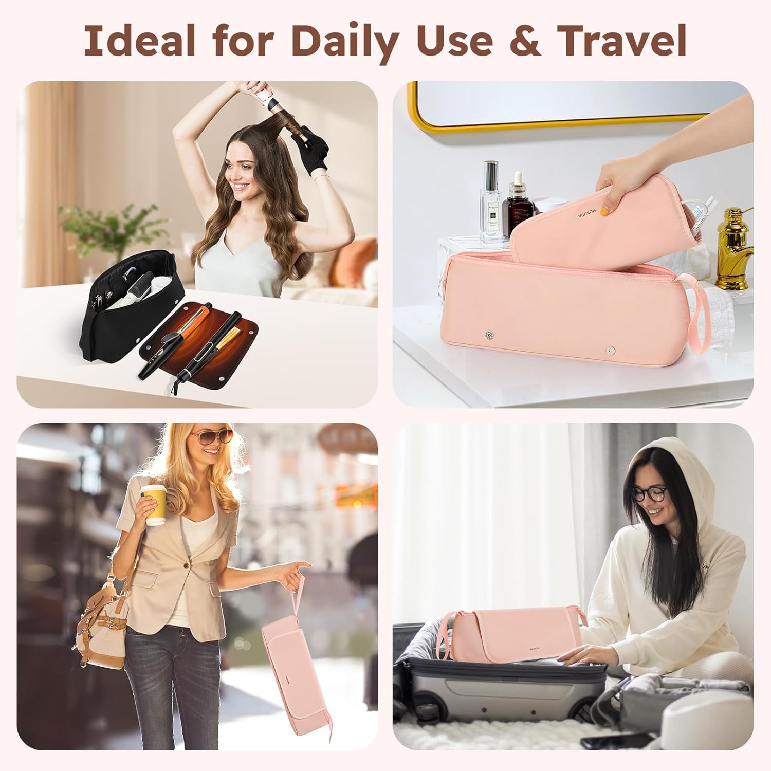 MOKURA Hot Hair Tools Travel Bag with Heat Resistant Mat, Women Hair Accessories Organizer Case, Storage Pouch for Curling Iron Straightener Flat Iron, Stocking Stuffers for Women, Gifts for Mom, Pink