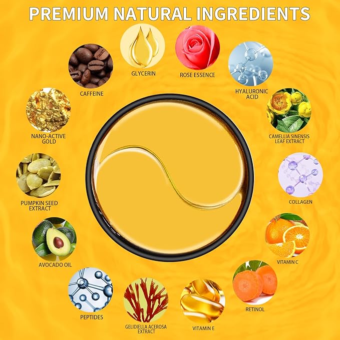 - Top-Quality Natural Components: Our under eye patches feature a mix of high-grade natural elements like caffeine, nano-active gold, pumpkin seed extract, and hyaluronic acid, delivering a revitalizing and hydrating treatment for the under eye area. Whether you're seeking eye patches for wrinkles or options for puffy eyes treatment, our eye treatment products address multiple needs, ensuring satisfaction and providing an effective dark circles under eye treatment for women and men.