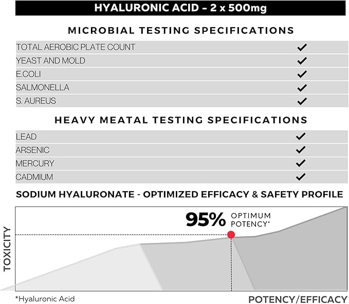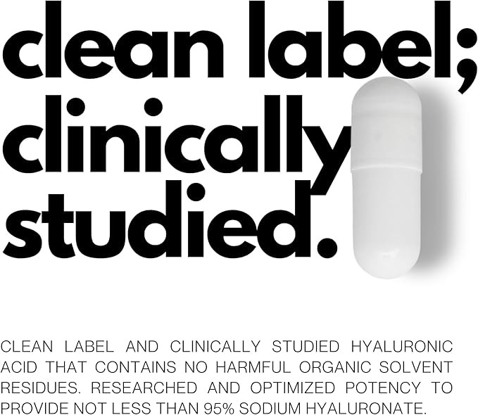 - Clean label and Potent: Backed by research and clinical studies, our hyaluronic acid supplement is 100% clean label, free from excipients, additives, or artificial elements. It delivers a potent dosage of pure hyaluronic acid to support joint health and promote a smoother, more youthful complexion.