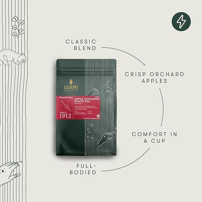 - Crafted with Care: At Luxmi Estates, we take pride in our commitment to quality and craftsmanship. Each batch of Apple Cinnamon Black Tea is meticulously blended and packaged with care, ensuring that you receive only the finest tea experience every time