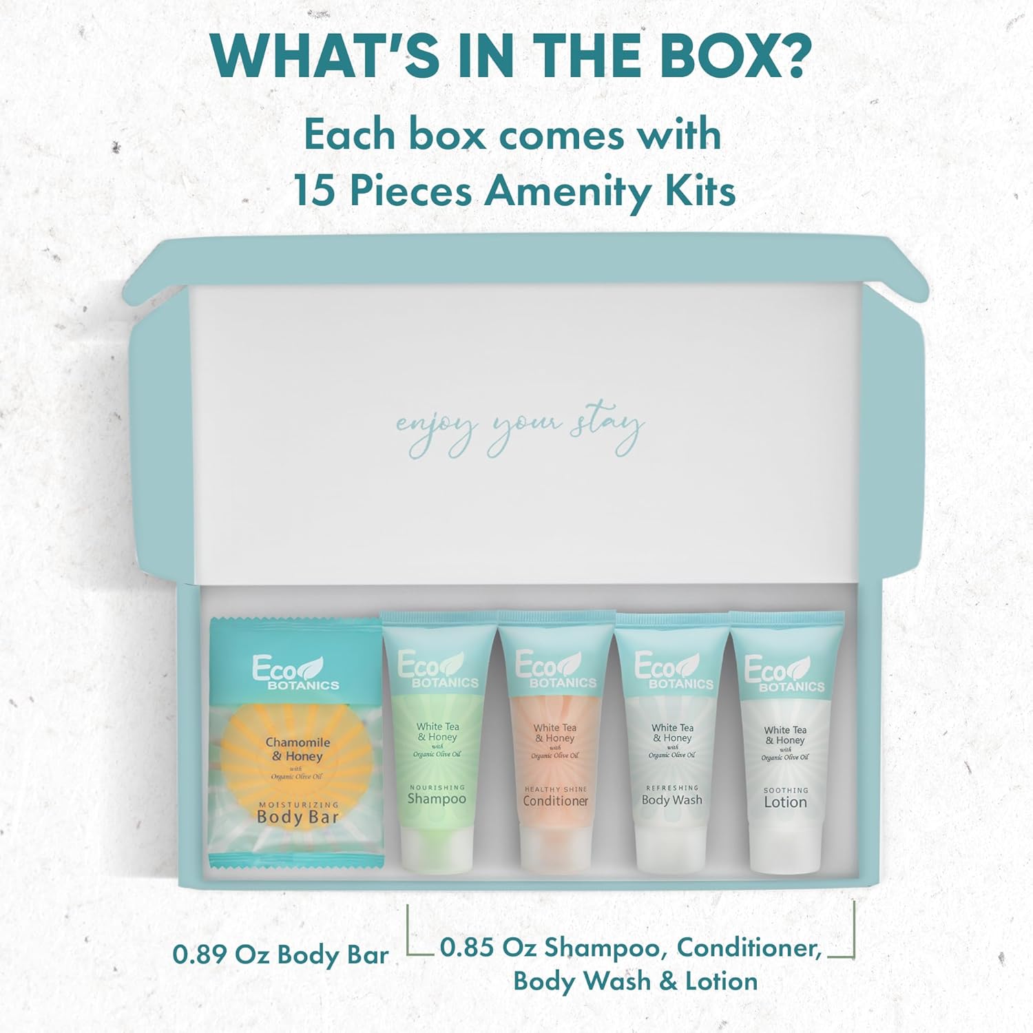 - COMPREHENSIVE 15-BOX CASE: Elevate your guest experience with our Guest Boxes that include 1 of each of the following: shampoo, conditioner, body lotion, body wash, and body bar.