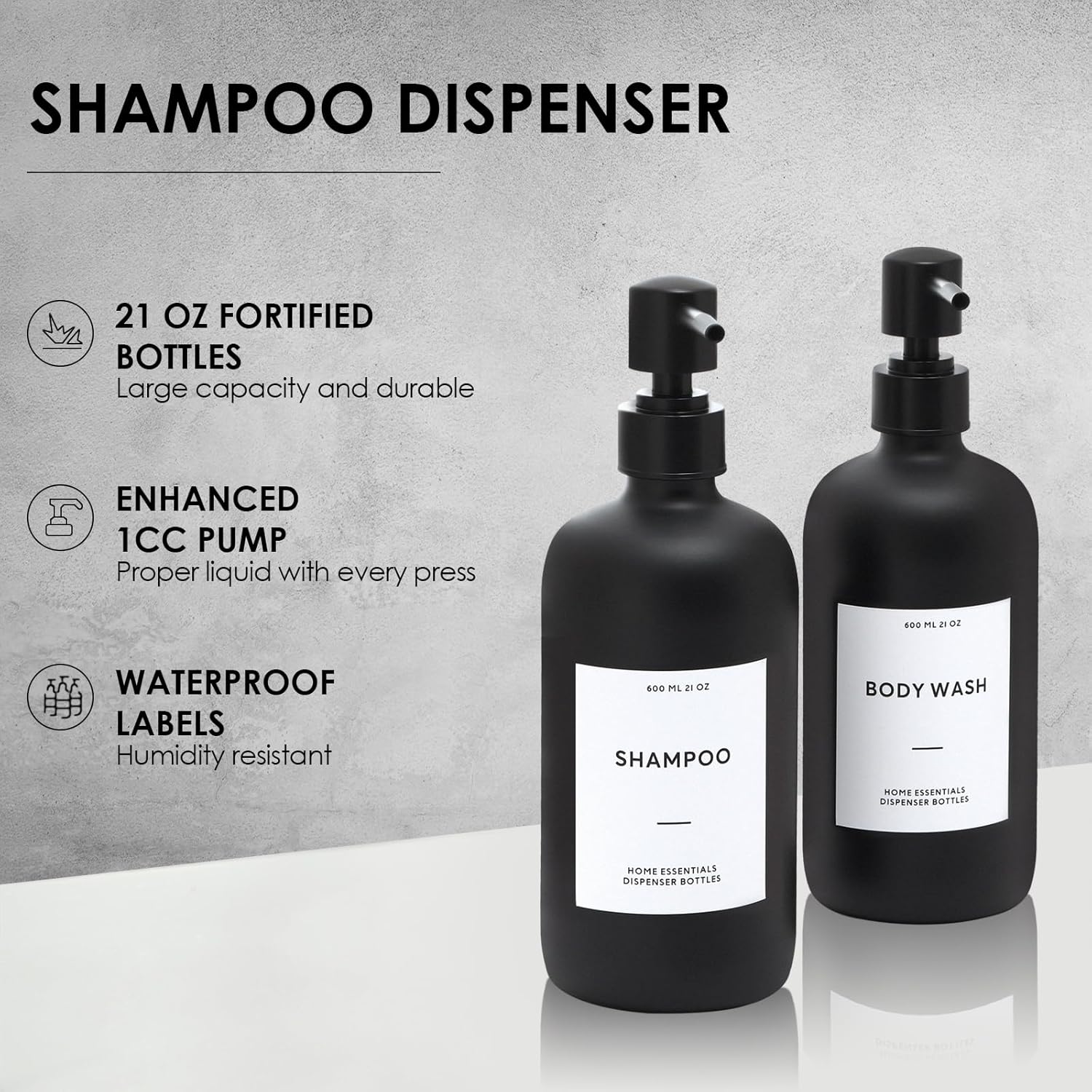 - BATHROOM SHOWER DISPENSER SET OF 3 - The Bathroom dispenser set contains 3-Pack 21oz(600ml) black bottles, 3 black pumps, 5 waterproof white labels(“SHAMPOO”, “CONDITIONER”, "BODY WASH", "HAND SOAP", "DISH SOAP"), the pump bottles for shampoo and conditioner are instantly help to organize your bathroom, Perfect Bathroom Essentials for home or hospitality.