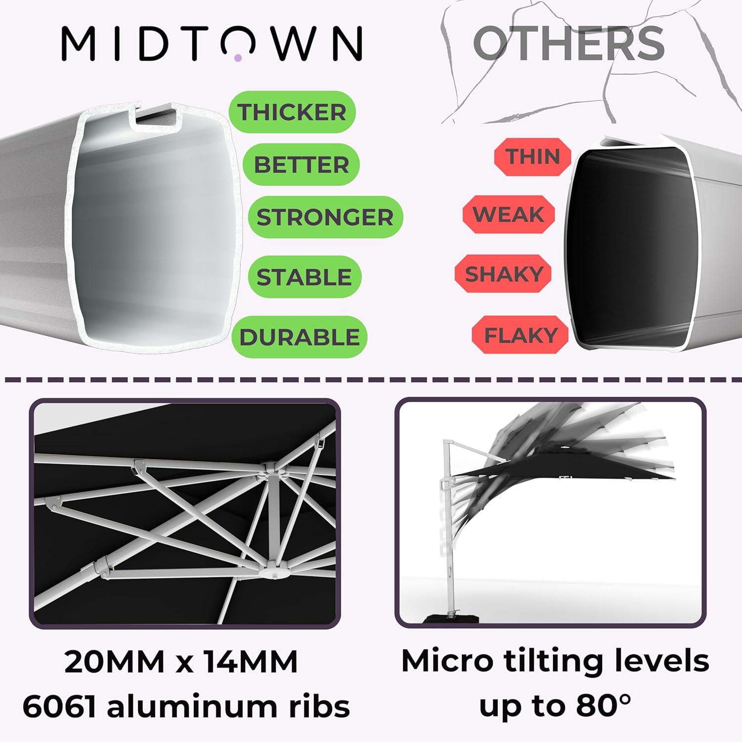 Midtown Umbrellas 10 Ft Outdoor Cantilever Patio Umbrella w/Terylast Ebony Black Fabric - Rotate 360° Offset Patio Umbrella, Deck Patio Umbrella, Backyard Umbrella & Garden Umbrella - Silver Frame