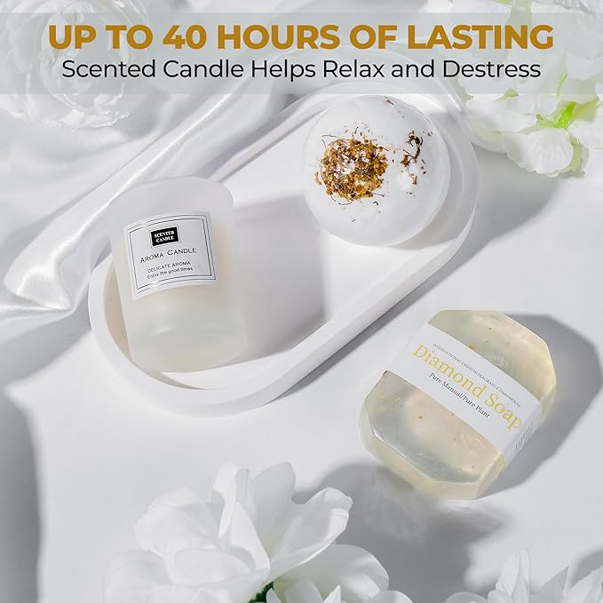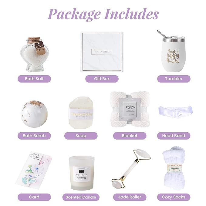 - ๐ธ UNWIND IN STYLE: A soft blanket, cozy socks, and aromatic candles ensure that relaxation comes easy and feels indulgent with our spa day essentials. These items are hand picked to ensure the best and most relaxing home self care spa experience, something every woman would love and appreciate. These items are hand picked to ensure the best and most relaxing home self care spa experience, something every women would love and appreciate. Our bath sets for women are an amazing gift for any occasion.