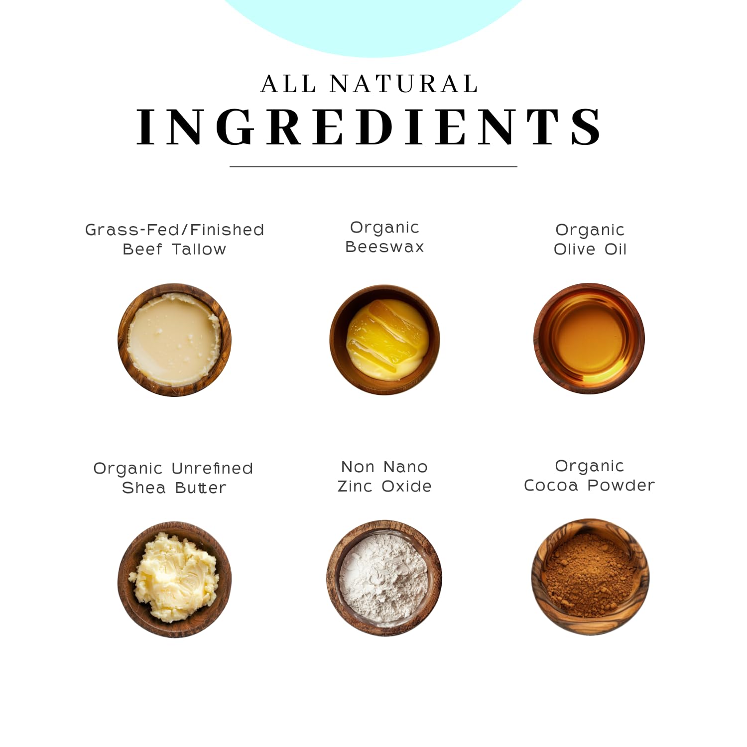 - Skin Loving Ingredients: This daily face sunscreen with zinc oxide uses 100% edible ingredients and absorbs in a few minutes. The zinc oxide facial sunscreens are packed with 100% grass-fed tallow, organic olive oil, organic beeswax, organic shea butter, & organic cocoa powder.