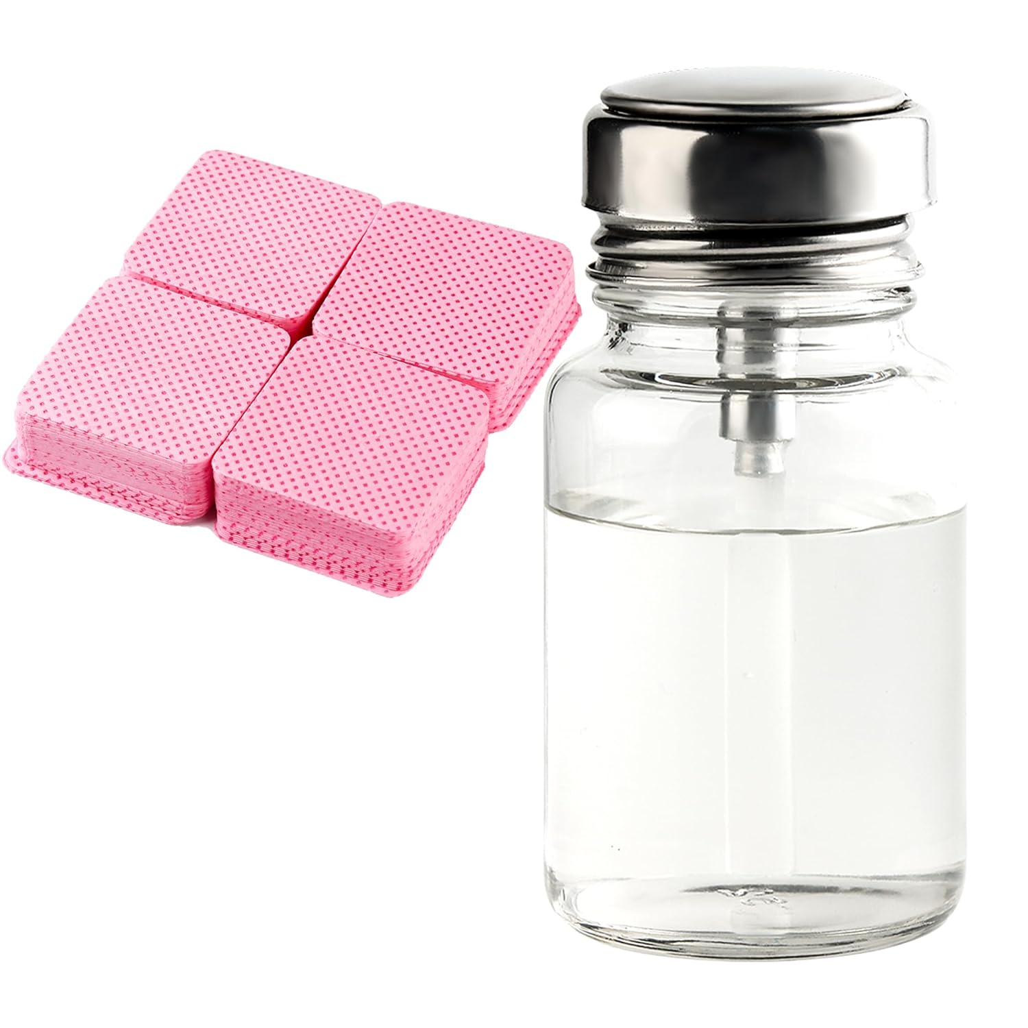 Clear Nail Polish Remover - 120ml Glass Metal Push Down Pump Dispenser - 200pcs Lint Free Nail Wipes - Alcohol Eye Makeup Remover