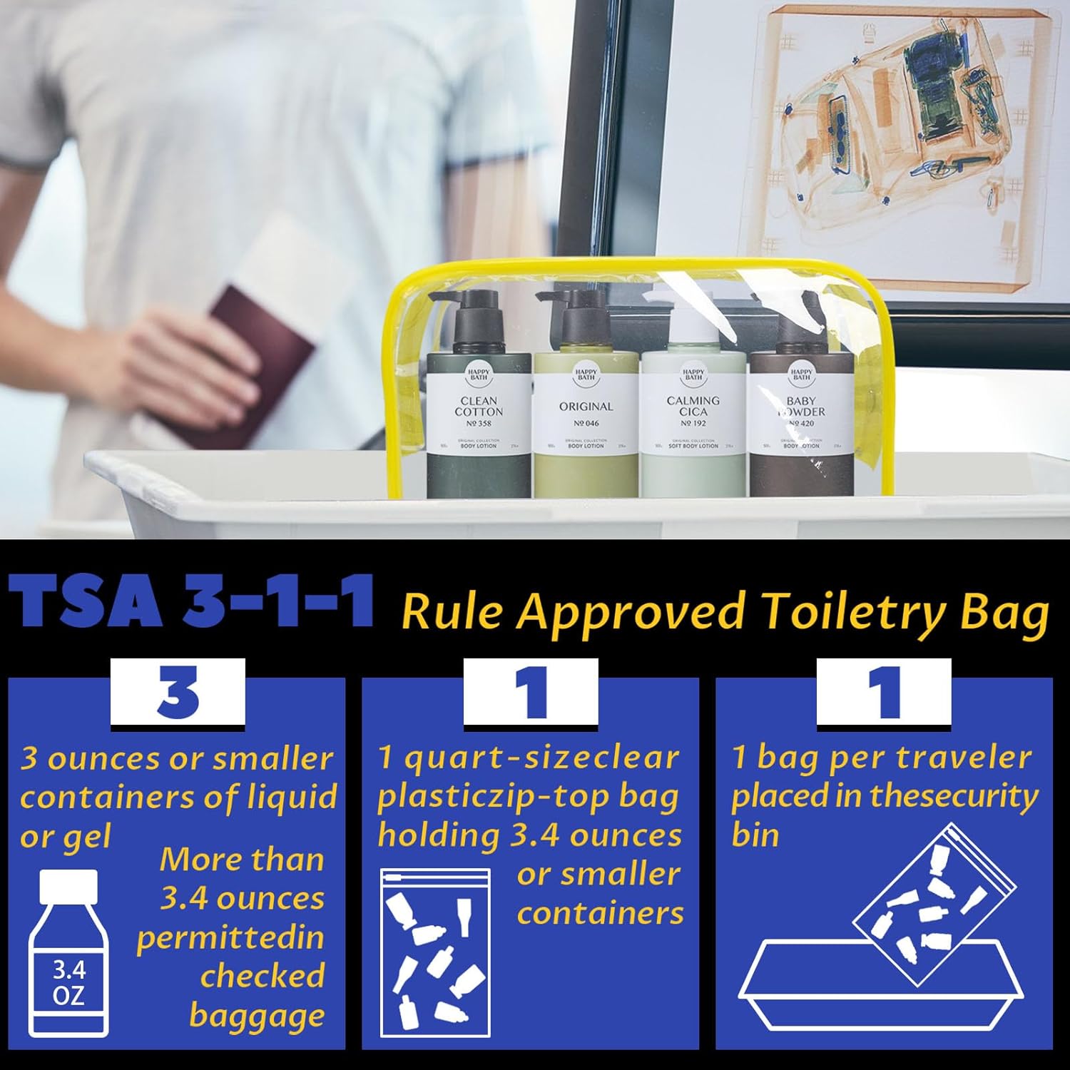 - TSA Approved Clear Toiletry Bag Carry-On Size: Our Bag Size of each is about 7.28"x 2.36"x 5.11"(18.5 X 6 X 13CM). Weight: 0.055lb/ 25.3g. you can carry them anywhere, the enough capacity is suitable to store your small items like lipsticks, eyeshadow and other things; These clear travel bags for toiletries strictly follow 3-1-1 liquids rules for carry-on bag of all airlines. Easy and quick to pass through airport security.