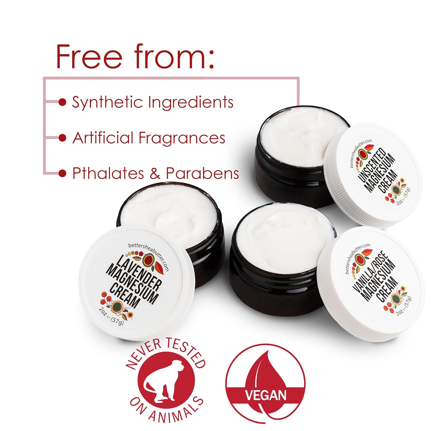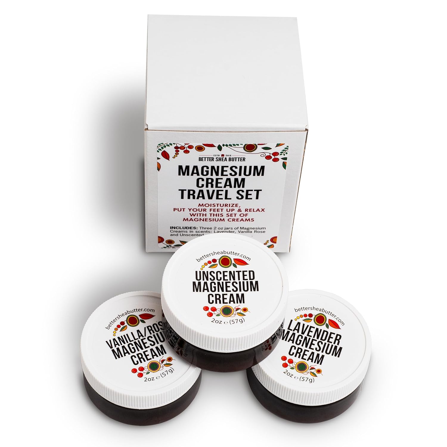 Better Shea Butter Magnesium Cream Variety Pack | for Leg Cramps | Vanilla Rose, Unscented and Lavender Travel Size Lotion Minis for Women and Men | Safe for Pregnancy, Kids & Babies 3 x 2oz Jars