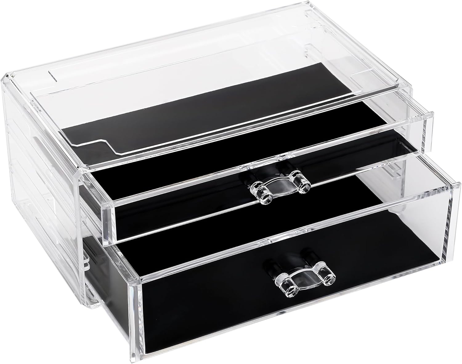 - CLEAR, SLEEK & ELEGANT DESIGN - The transparent style of this makeup case with black flocked cloth allows for easy visibility of your items and creates an appealing display that coordinates with any decor. A perfect storage solution for any makeup lover or fashion enthusiast