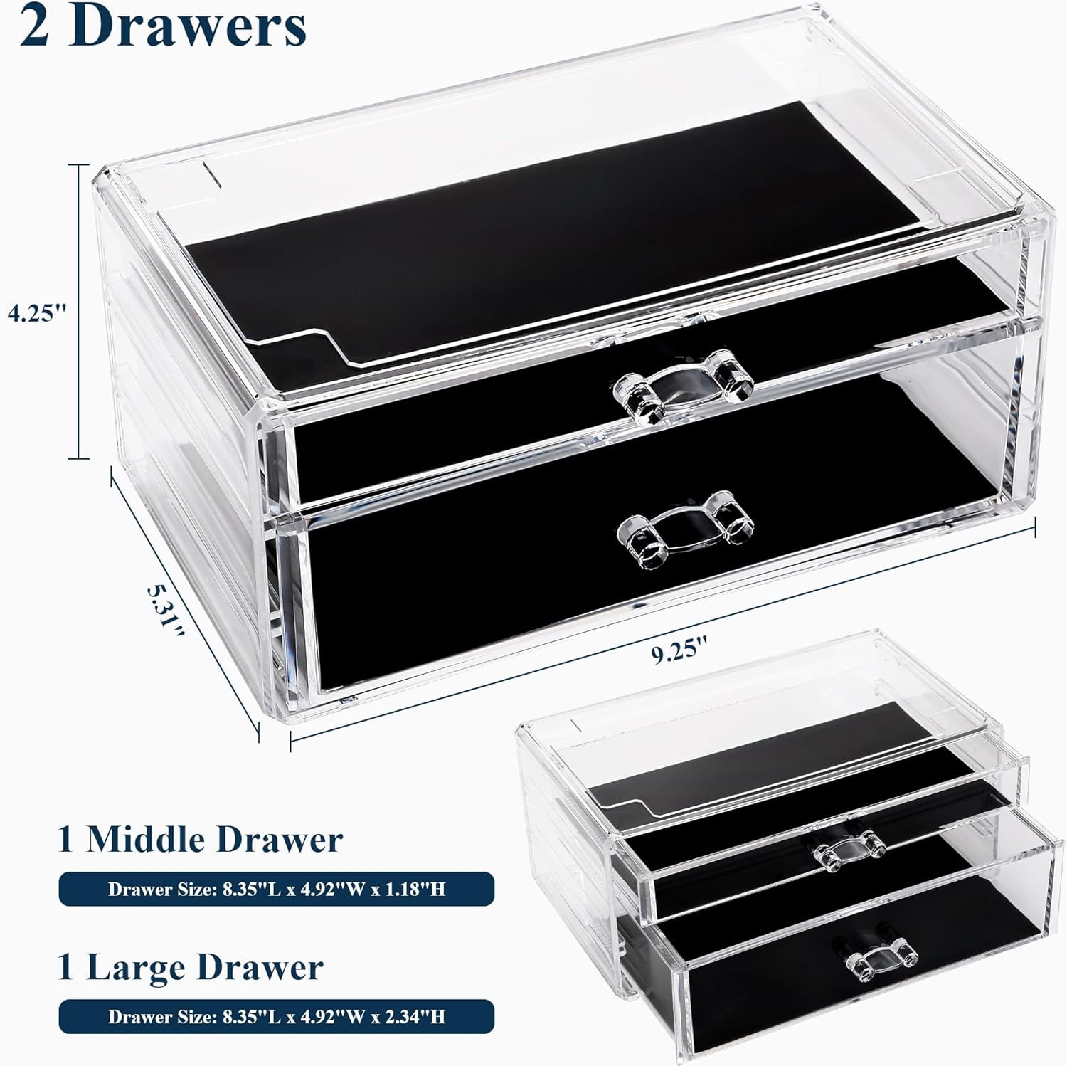- DISPLAY & STORE BEAUTIFULLY - From cosmetics to jewelry, this organizer is versatile enough to suit any storage needs. With 1 large and 1 small drawers, you can store all your beauty essentials in one convenient place