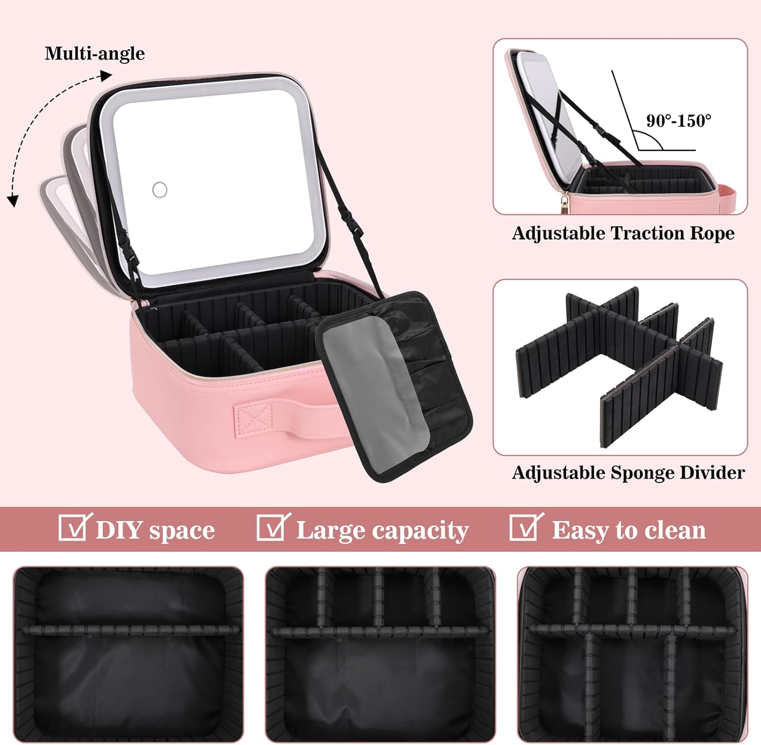 Makeup Case with LED Mirror,Makeup Organizer Bag Travel Makeup Case Large Makeup Bag With Rechargeable Mirror 3 Color Lights Detachable Mirror for Women Beauty Tools Accessories(Pink)