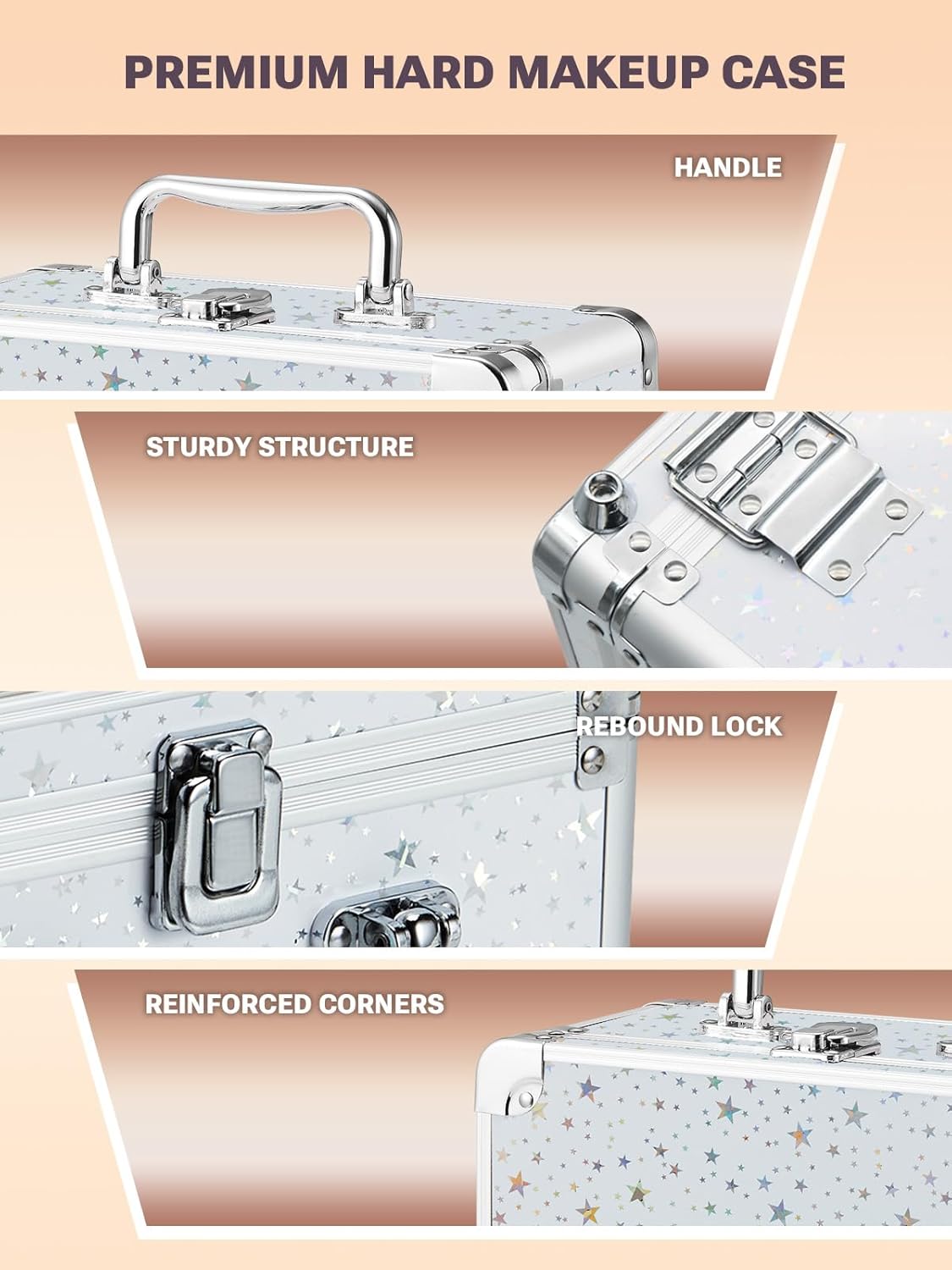 - Professional Hard Makeup Travel Case: Measuring 9.6x8.3x4.9 inches, this portable case is ideal for all makeup artists. Made with cardboard and metal-reinforced corners for durability, it features a latch with a quick rebound lock