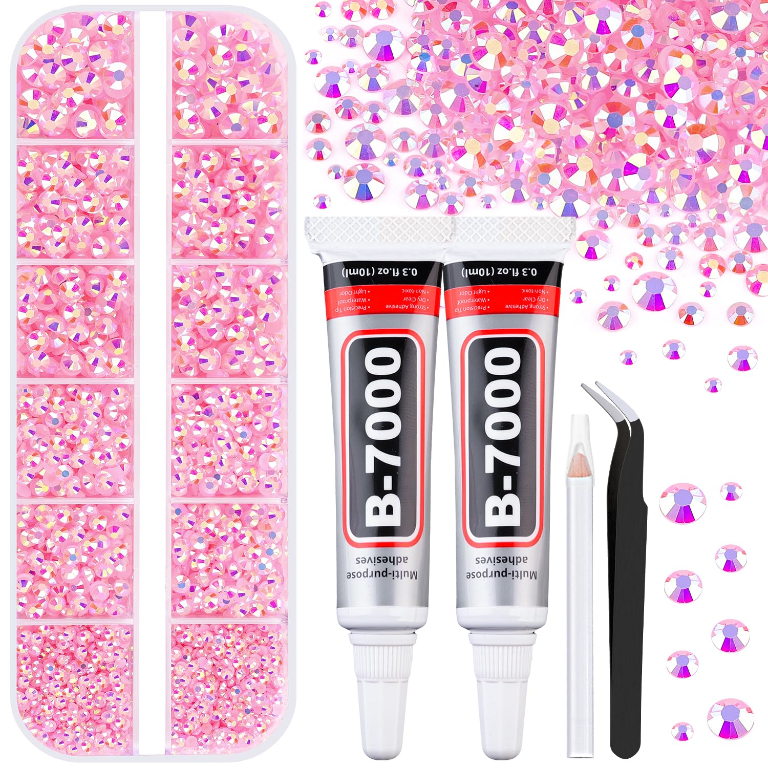 6100Pcs Jelly Resin Rhinestones for Crafting with 2Pcs 10ml B7000 Jewelry Glue, 1 Box Flatback Crystals Diamond (Light Pink AB) for Bedazzling Crafts DIY Nail Art Non Hotfix Gems for Clothing Shoes